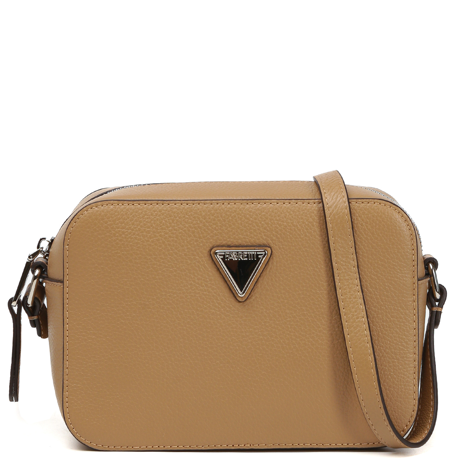 Стильная кросс-боди FABRETTI в темно-бежевом оттенке выполнена из натуральной зернистой кожи. Сумка закрывается на полукруглую молнию с кожаным поводком. Внутри 2 боковых кармана для мелочей: открытый и на молнии. На тыльной стороне расположен карман быстрого доступа на молнии. Плечевой ремень регулируется по длине, ширина - 1,5 см. Цвет фурнитуры - серебро.
