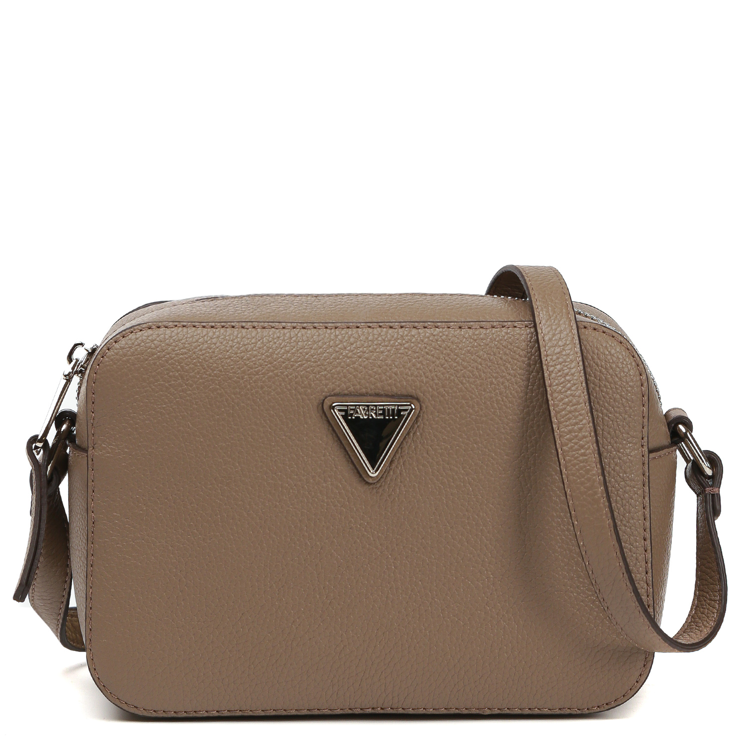 Стильная кросс-боди FABRETTI в темно-бежевом оттенке выполнена из натуральной зернистой кожи. Сумка закрывается на полукруглую молнию с кожаным поводком. Внутри 2 боковых кармана для мелочей: открытый и на молнии. На тыльной стороне расположен карман быстрого доступа на молнии. Плечевой ремень регулируется по длине, ширина - 1,5 см. Цвет фурнитуры - серебро.