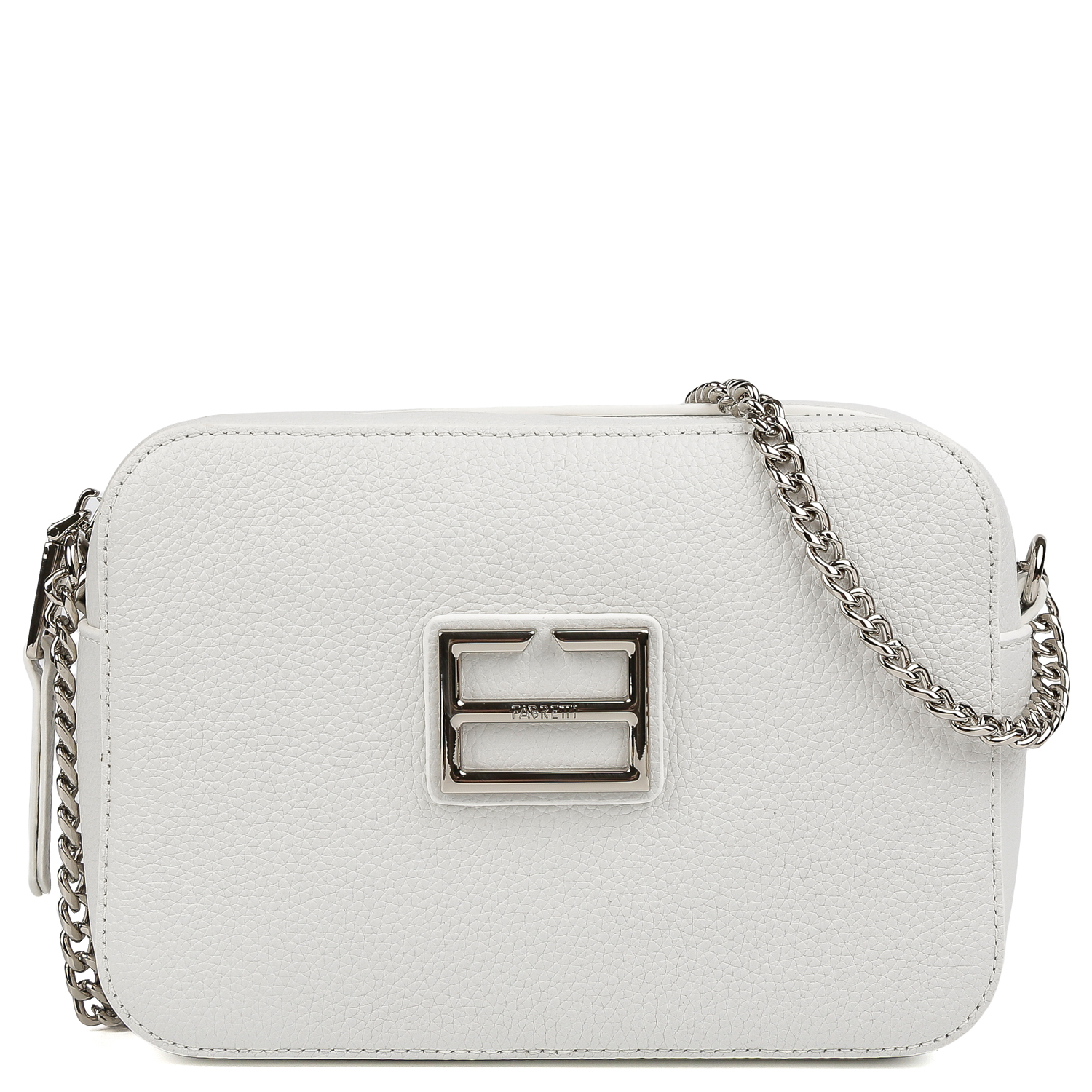 Компактная кросс-боди FABRETTI в белом цвете выполнена из натуральной высококачественной зернистой кожи, приятной на ощупь. Основное отделение закрывается на полукруглую молнию с кожаным поводком. Внутри 2 боковых кармана: открытый и на молнии. На тыльной стороне предусмотрен карман быстрого доступа на молнии. Лицевая сторона декорирована оригинальной фурнитурой. Изящный плечевой ремень сочетает металлическую цепочку с вставками из натуральной кожи. Цвет фурнитуры - серебро.