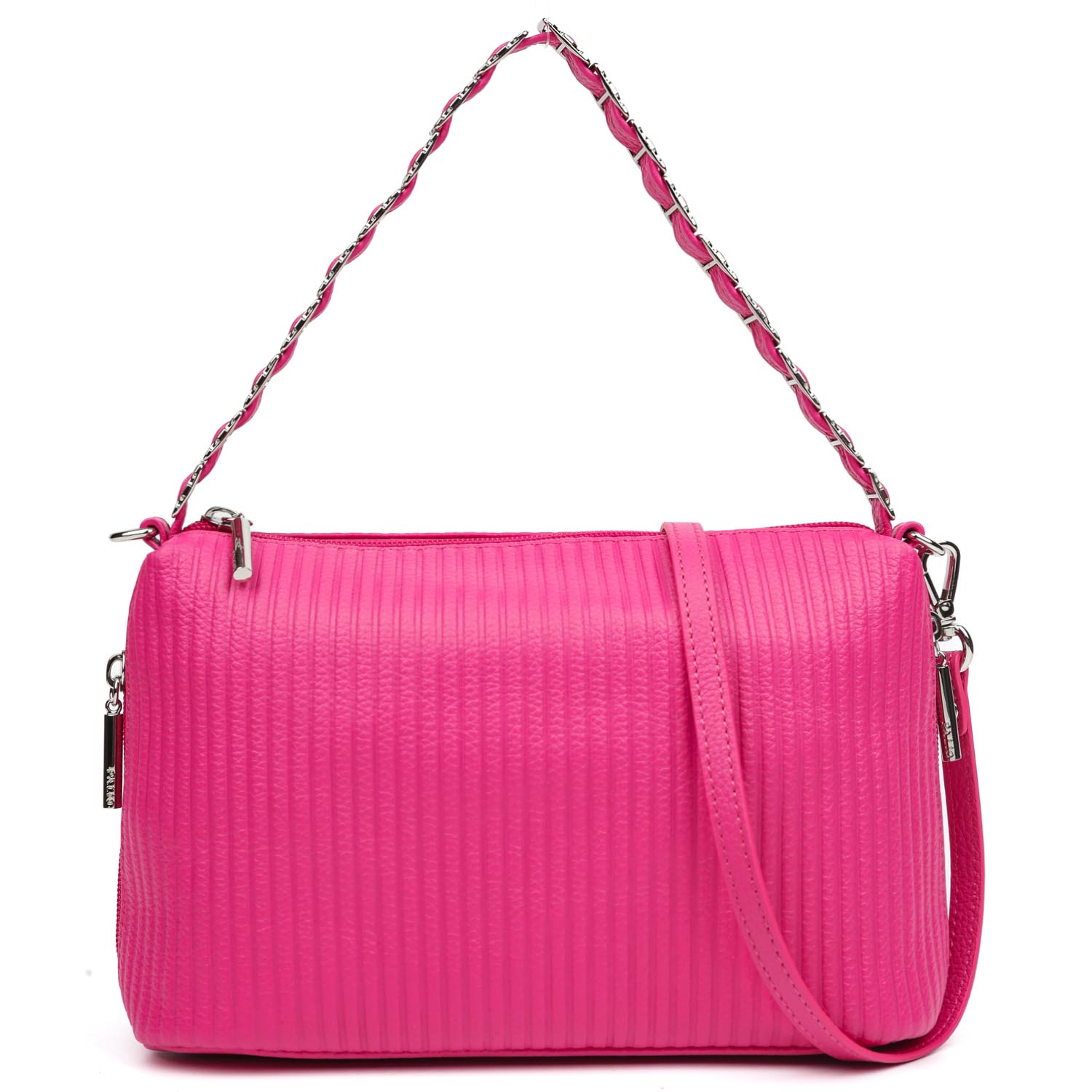 Стильная кросс-боди PALIO в розовом оттенке выполнена из натуральной зернистой кожи и декорирована геометрическим тиснением. Идеальный размер для прогулок. Основное отделение закрывается на молнию с металлическим поводком. Внутри расположены 2 отсека, разделенные средником на молнии. В одном имеется карман на молнии, в другом - 2 открытых кармана для смартфона и мелочей. На внешних боковых стенках - удобные вертикальный кармашки быстрого доступа на молнии. Съемный плечевой ремень регулируется по длине, ширина - 1 см. Цвет фурнитуры - серебро.