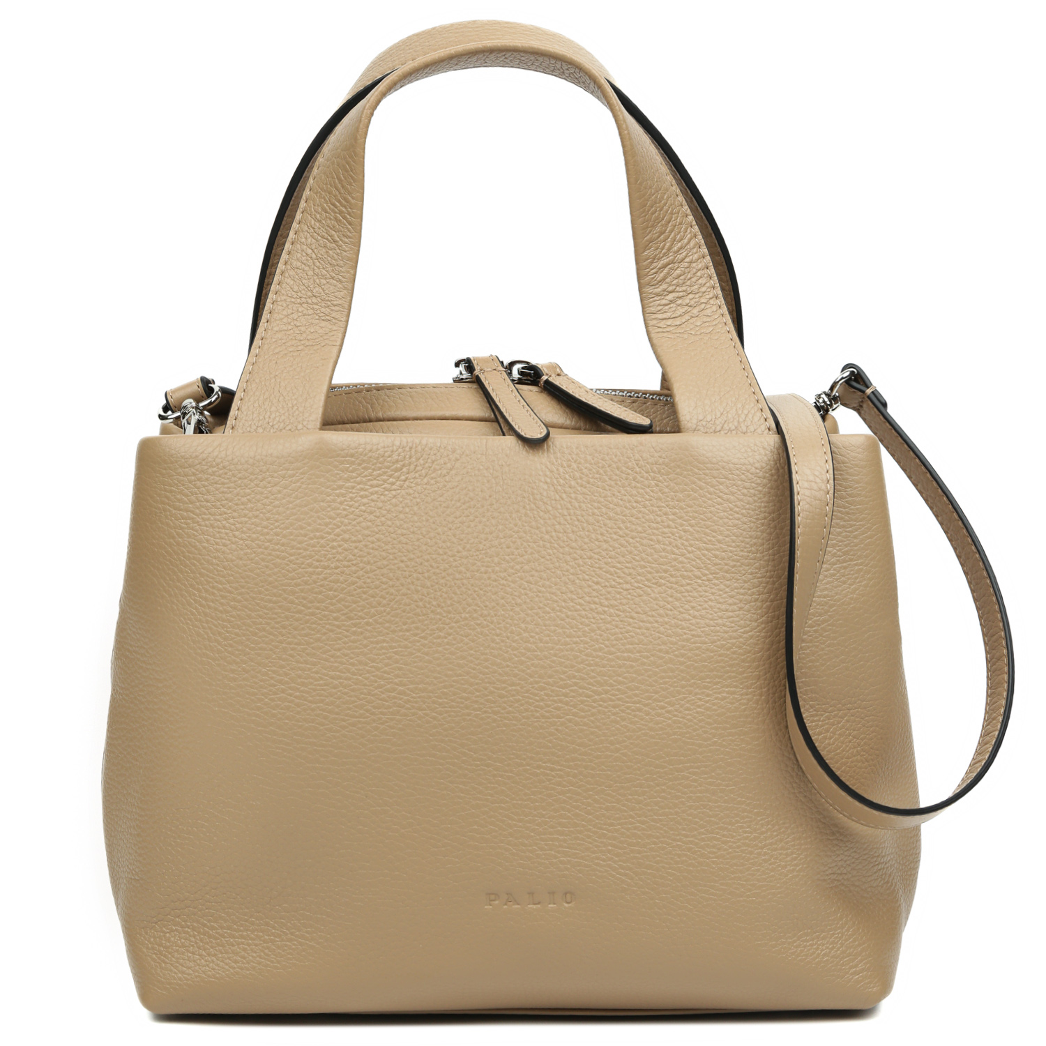 Компактная сумка-тоут PALIO в темно-бежевом оттенке выполнена из натуральной зернистой кожи. Сумка закрывается на молнию с 2 бегунками. Внутри есть 3 боковых кармана для мелочей: 2 открытых и на молнии. На лицевой и тыльной сторонах предусмотрены вместительные карманы быстрого доступа, закрывающиеся на магнитную кнопку. Дно сумки защищают 4 металлические ножки. Ручки позволяют комфортно носить аксессуар в руке. В комплекте идет съемный плечевой ремень, регулируемый по длине, ширина - 1,5 см. Цвет фурнитуры - серебро.