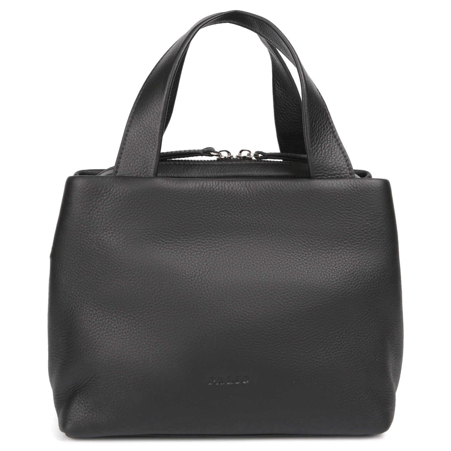 Компактная сумка-тоут PALIO в черном цвете выполнена из натуральной зернистой кожи. Сумка закрывается на молнию с 2 бегунками. Внутри есть 3 боковых кармана для мелочей: 2 открытых и на молнии. На лицевой и тыльной сторонах предусмотрены вместительные карманы быстрого доступа, закрывающиеся на магнитную кнопку. Дно сумки защищают 4 металлические ножки. Ручки позволяют комфортно носить аксессуар в руке. В комплекте идет съемный плечевой ремень, регулируемый по длине, ширина - 1,5 см. Цвет фурнитуры - серебро.