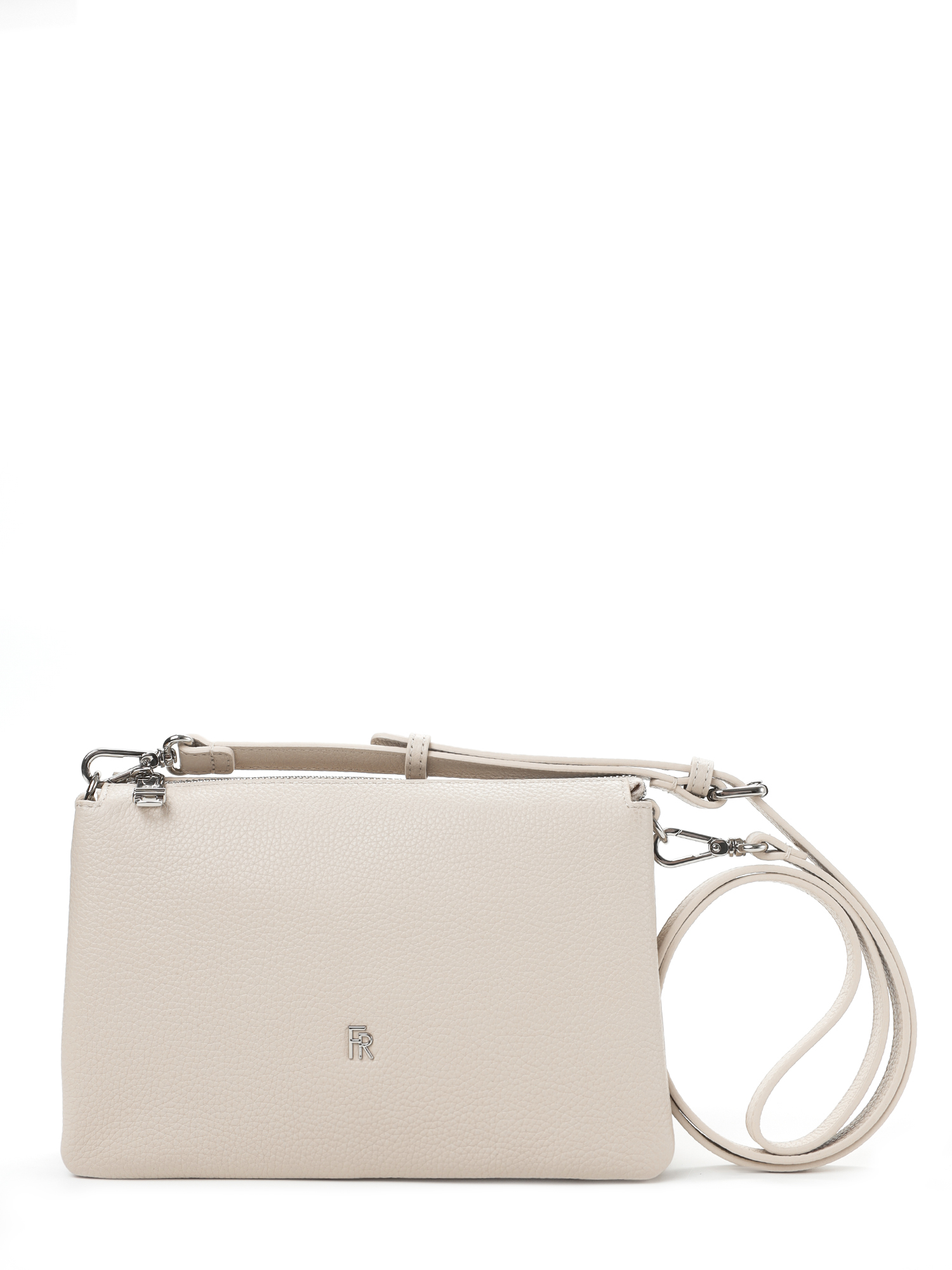 Модель выполнена из натуральной мягкой кожи светло-бежевого молочного цвета с зернистой фактурой. Основное отделение разделено на три секции и закрывается на металлическую молнию. Внутри расположены открытый карман и на молнии.