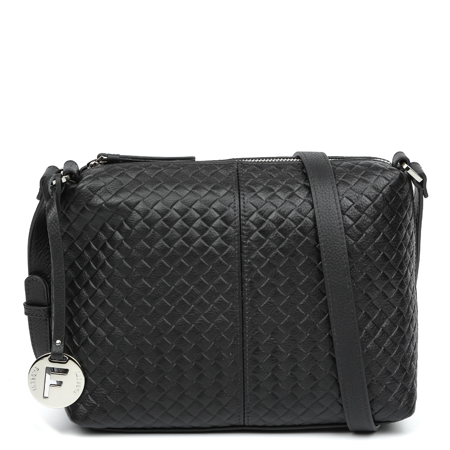 Стильная кросс-боди FABRETTI выполнена из натуральной зернистой кожи в черном цвете и декорирована тиснением, имитирующим плетение. Основное отделение закрывается на молнию с кожаным поводком. Внутри есть 2 боковых кармана для мелочей: открытый и на молнии. На тыльной стороне предусмотрен карман быстрого доступа на молнии. Круглая металлическая подвеска с силуэтом монограммы бренда гармонично дополняет дизайн изделия. Плечевой ремень регулируется по длине, ширина - 2 см. Цвет фурнитуры - серебро.