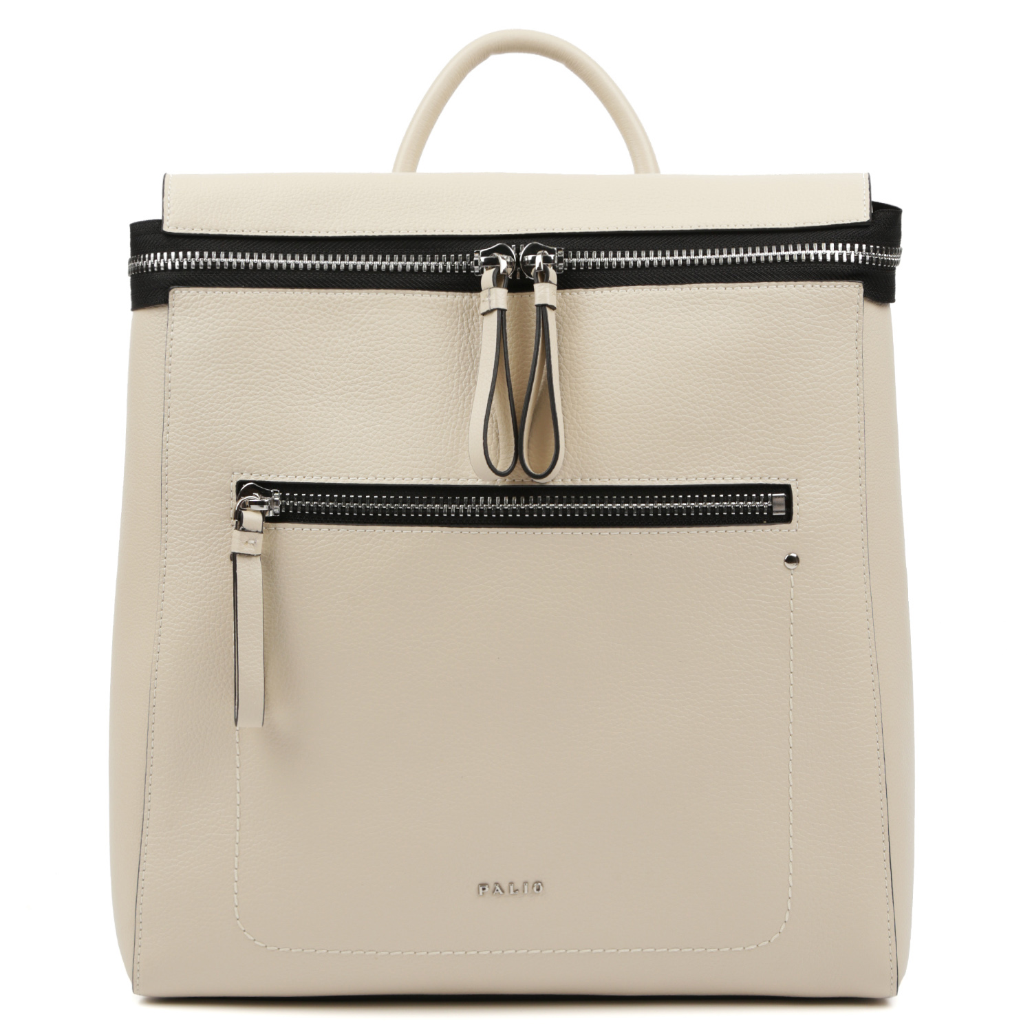 Стильный рюкзак PALIO в светло-бежевом оттенке выполнен из натуральной зернистой кожи. Основное отделение закрывается клапаном с крупной молнией с 2 бегунками, концы которой с помощью кнопок пристегиваются к обратной стороне изделия. Внутри 3 боковых кармана для мелочей: 2 открытых и на молнии. На лицевой стороне расположен вместительный карман на молнии. На тыльной стороне предусмотрен открытый прорезной карман быстрого доступа. Сверху есть ручка, позволяющая комфортно носить изделие в руке. 2 лямки шириной 2 см. регулируются по длине и позволяют комфортно носить аксессуар на спине. Цвет фурнитуры - серебро.