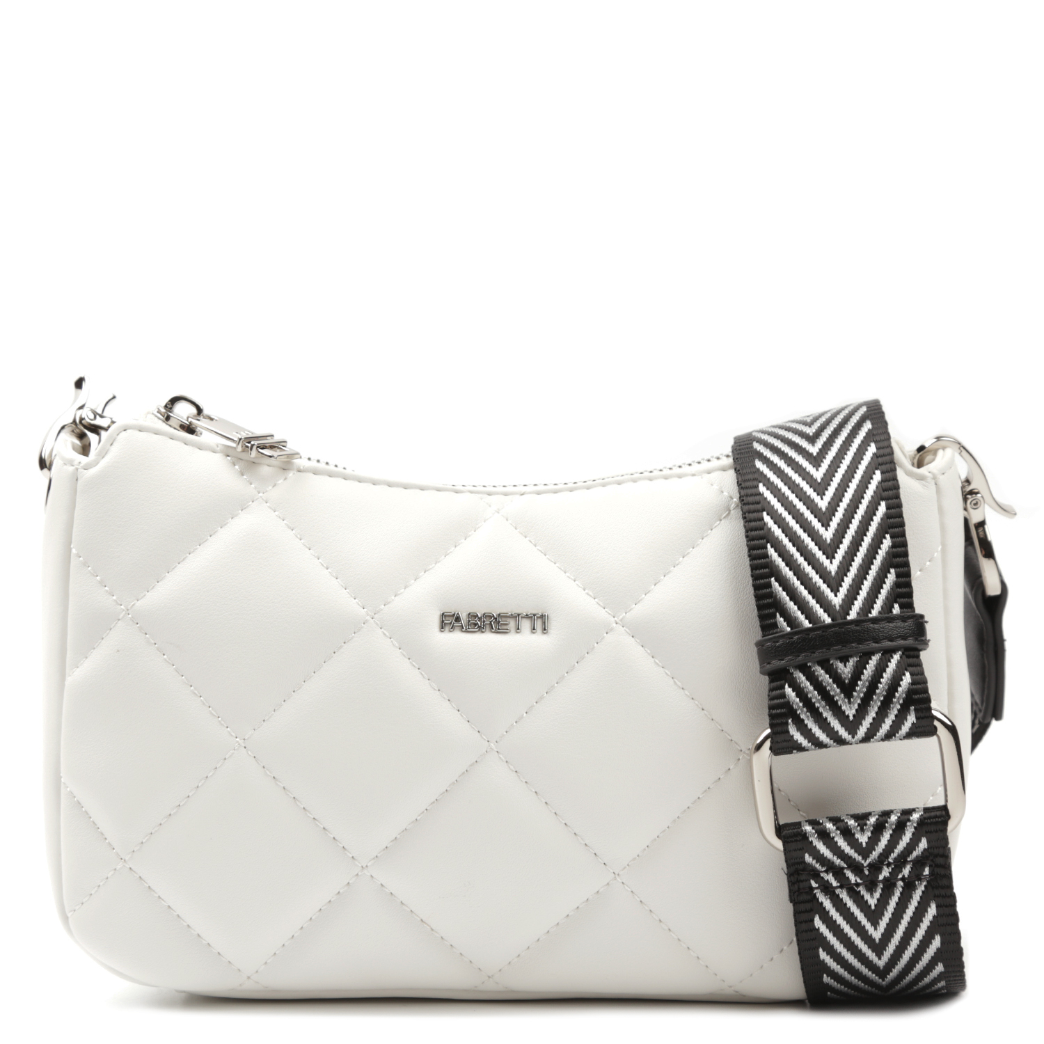 Стильная сумка кросс-боди FABRETTI в белом цвете выполнена из натуральной кожи гладкой фактуры и декорирована ромбовидной стежкой. Основное отделение закрывается на молнию с металлическим поводком. Внутри 2 боковых кармана для мелочей: открытый и на молнии. Широкий текстильный ремень съемный, регулируется по длине и гармонично дополняет дизайн изделия. Ширина плечевого ремня - 4 см. Цвет фурнитуры - серебро.