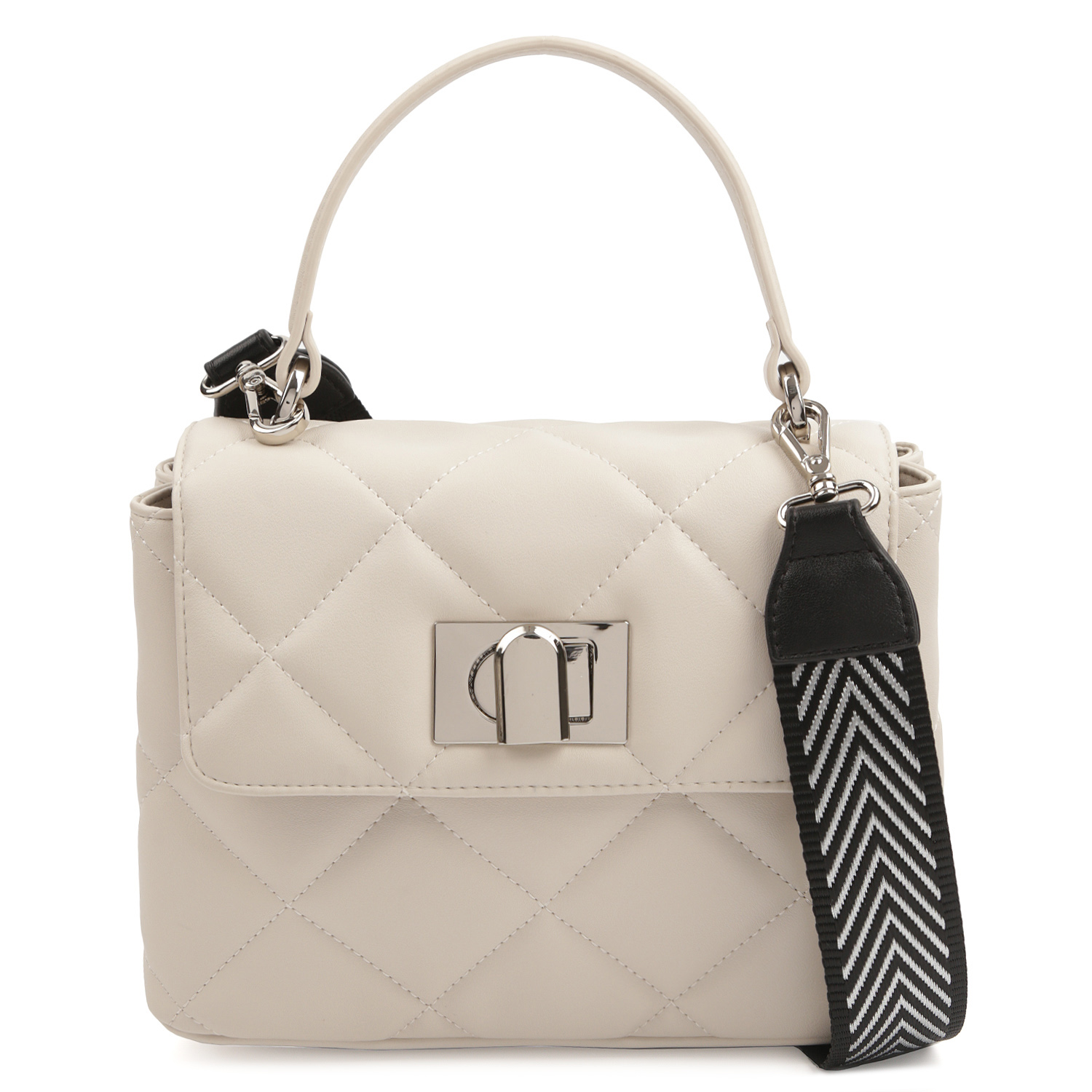 Стильная сумка-сэтчел FABRETTI в бежевом оттенке выполнена из натуральной гладкой кожи и декорирована ромбовидной стежкой. Сумка закрывается клапаном с оригинальным поворотным замком. Внутри 2 боковых кармана для мелочей: открытый и на молнии. Сверху предусмотрена ручка, позволяющая комфортно носить аксессуар в руке. Текстильный плечевой ремень съемный, регулируется по длине, ширина - 4 см. Цвет фурнитуры - серебро.