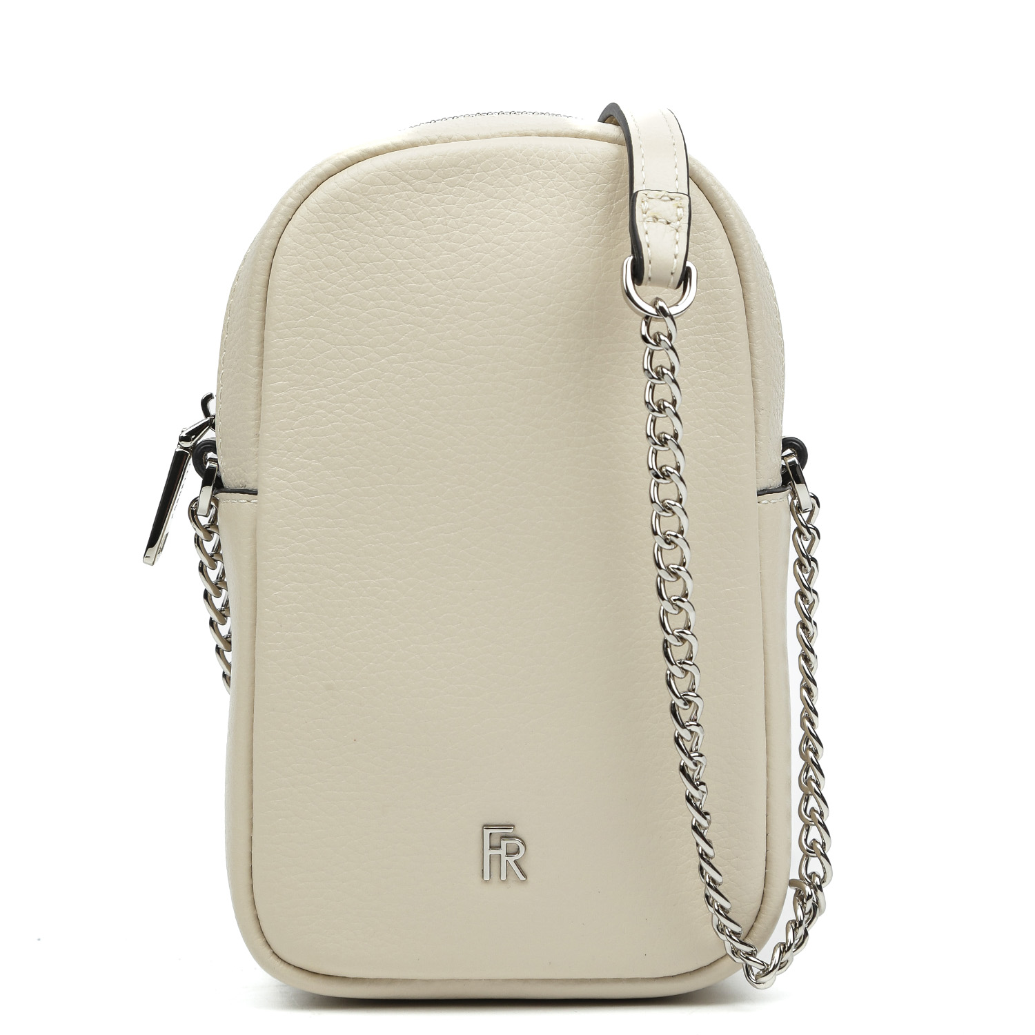 Оригинальная кросс-боди FABRETTI из натуральной зернистой кожи в светло-бежевом оттенке станет заметной деталью в образе. На лицевой стороне расположилась миниатюрная монограмма бренда. Сумка закрывается на полукруглую молнию. Изящный плечевой ремень регулируется по длине и сочетает металлическую цепочку со вставками из натуральной кожи. Цвет фурнитуры - серебро.