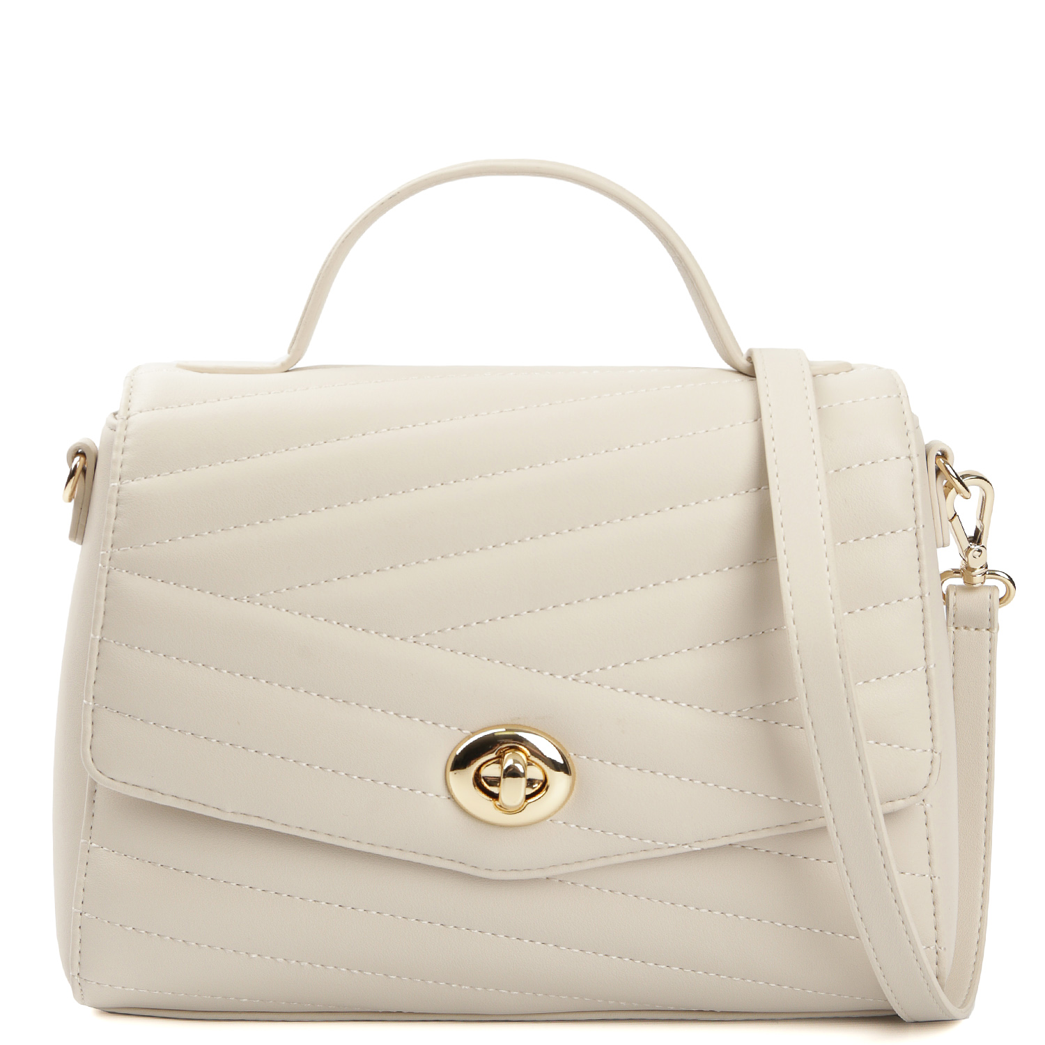 Стильная сумка-сэтчел FABRETTI в светло-бежевом оттенке выполнена из натуральной гладкой кожи и декорирована геометрической стежкой. Сумка закрывается клапаном с поворотным замком. Внутри 2 боковых кармана для мелочей: открытый и на молнии. Сверху предусмотрена ручка, позволяющая комфортно носить аксессуар в руке. Съемный плечевой ремень регулируется по длине, ширина - 1,5 см. Цвет фурнитуры - золото.