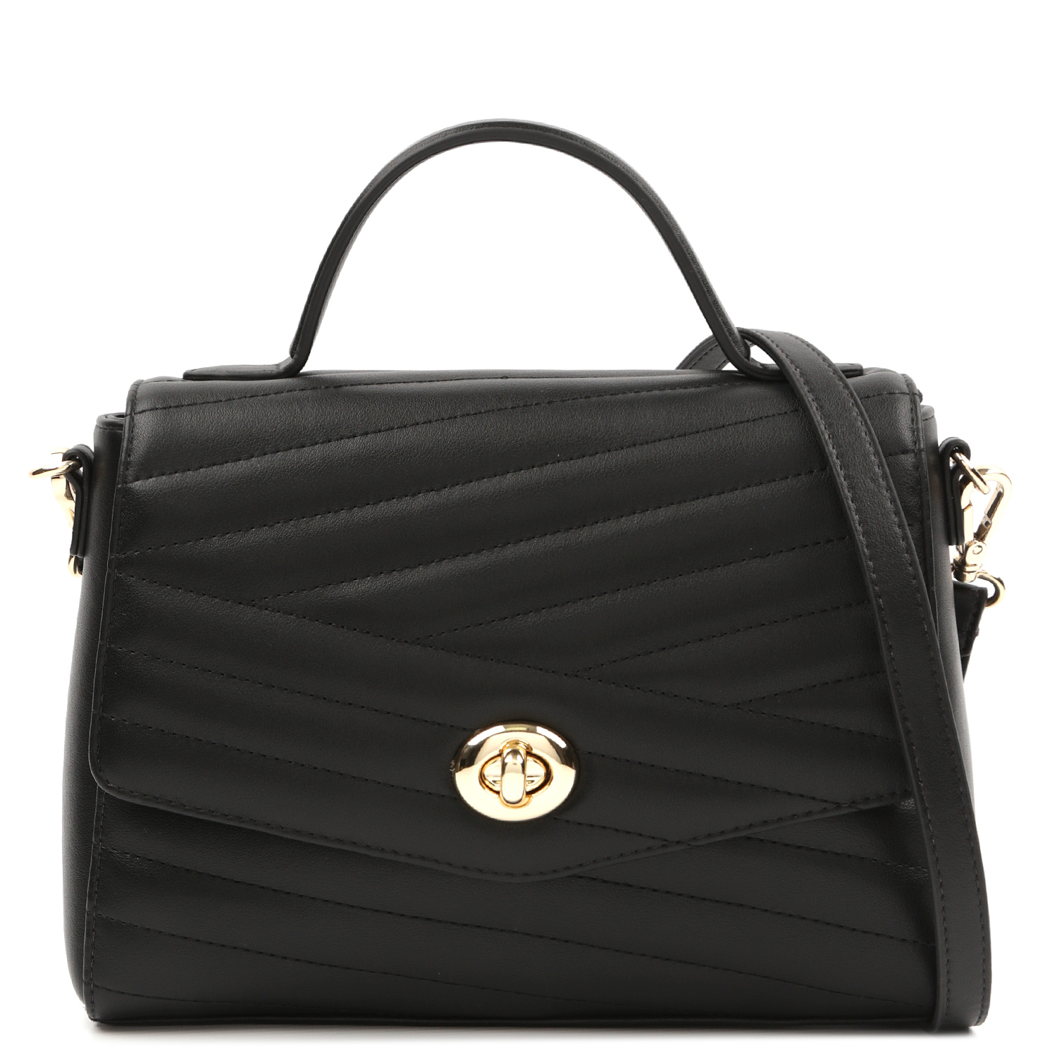 Стильная сумка-сэтчел FABRETTI в черном цвете выполнена из натуральной гладкой кожи и декорирована геометрической стежкой. Сумка закрывается клапаном с поворотным замком. Внутри 2 боковых кармана для мелочей: открытый и на молнии. Сверху предусмотрена ручка, позволяющая комфортно носить аксессуар в руке. Съемный плечевой ремень регулируется по длине, ширина - 1,5 см. Цвет фурнитуры - золото.
