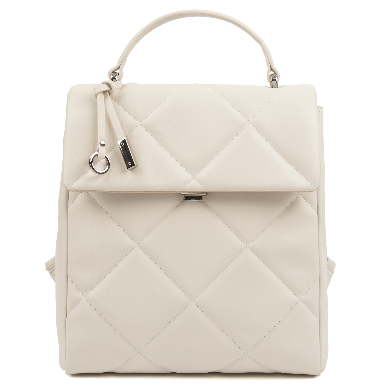 Стильный рюкзак FABRETTI в светло-бежевом оттенке выполнен из натуральной кожи гладкой фактуры и декорирован ромбовидной стежкой. Основное отделение закрывается клапаном с механическим замком. Внутри 3 боковых кармана для мелочей: 2 открытых и на молнии. На тыльной стороне расположен миниатюрный шильдик с монограммой бренда и предусмотрен вертикальный карман быстрого доступа на молнии с металлическим поводком. Сверху есть ручка, позволяющая комфортно носить изделие в руке. 2 лямки шириной 2 см. регулируются по длине и позволяют комфортно носить аксессуар на спине. Цвет фурнитуры - серебро.