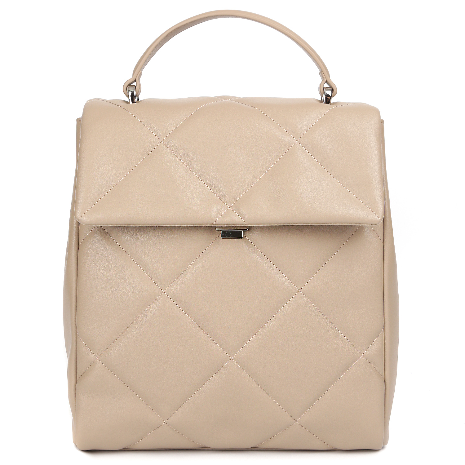 Стильный рюкзак FABRETTI в бежевом оттенке выполнен из натуральной кожи гладкой фактуры и декорирован ромбовидной стежкой на лицевой стороне. Основное отделение закрывается клапаном с механическим замком. Внутри 3 боковых кармана для мелочей: 2 открытых и на молнии. На тыльной стороне расположен миниатюрный шильдик с монограммой бренда и предусмотрен вертикальный карман быстрого доступа на молнии с металлическим поводком. Сверху есть ручка, позволяющая комфортно носить изделие в руке. 2 лямки шириной 2 см регулируются по длине и позволяют комфортно носить аксессуар на спине. Цвет фурнитуры - серебро.