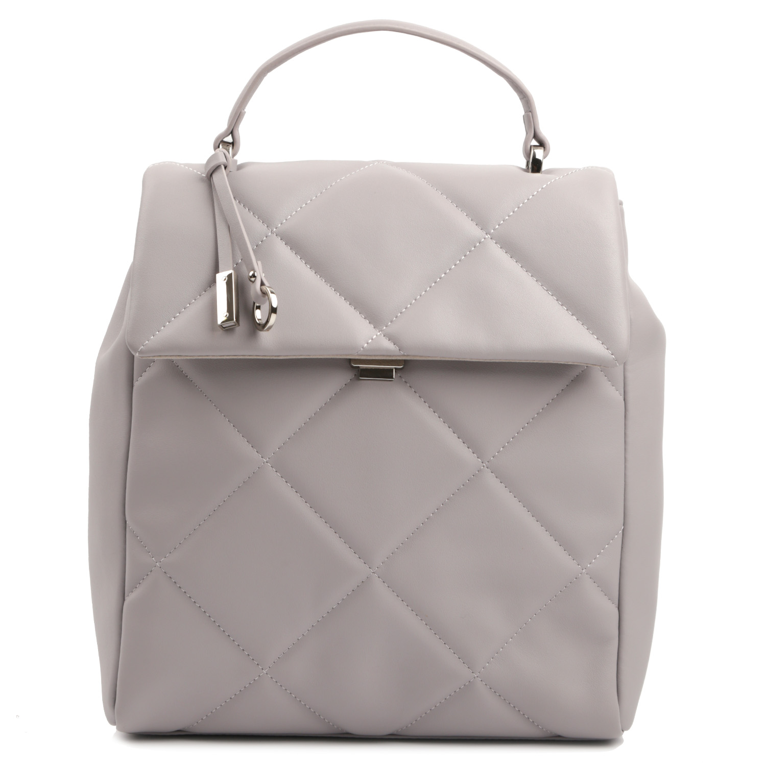 Стильный рюкзак FABRETTI в сером оттенке выполнен из натуральной кожи гладкой фактуры и декорирован ромбовидной стежкой. Основное отделение закрывается клапаном с механическим замком. Внутри 3 боковых кармана для мелочей: 2 открытых и на молнии. На тыльной стороне расположен миниатюрный шильдик с монограммой бренда и предусмотрен вертикальный карман быстрого доступа на молнии с металлическим поводком. Сверху есть ручка, позволяющая комфортно носить изделие в руке. 2 лямки шириной 2 см. регулируются по длине и позволяют комфортно носить аксессуар на спине. Цвет фурнитуры - серебро.