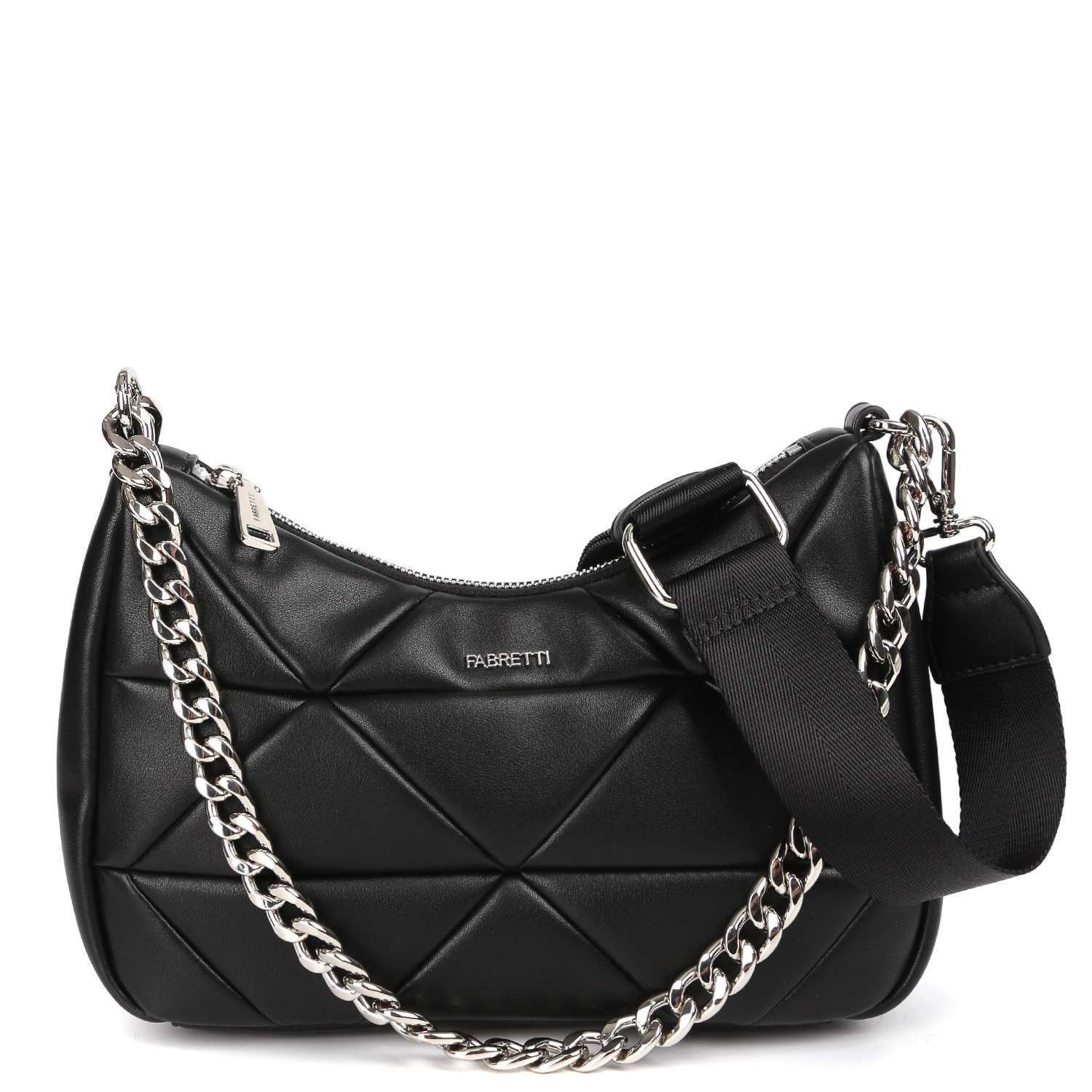 Оригинальная сумка через плечо FABRETTI в черном цвете выполнена из натуральной гладкой кожи и декорирована геометрической стежкой. Сумка закрывается на молнию с металлическим поводком. Внутри 2 боковых кармана для мелочей: открытый и на молнии. В качестве декора выступает съемная цепочка со средними звеньями, которая также может быть использована в качестве короткого ремня. Текстильный плечевой ремень съемный, регулируется по длине, ширина - 4 см. Цвет фурнитуры - серебро.