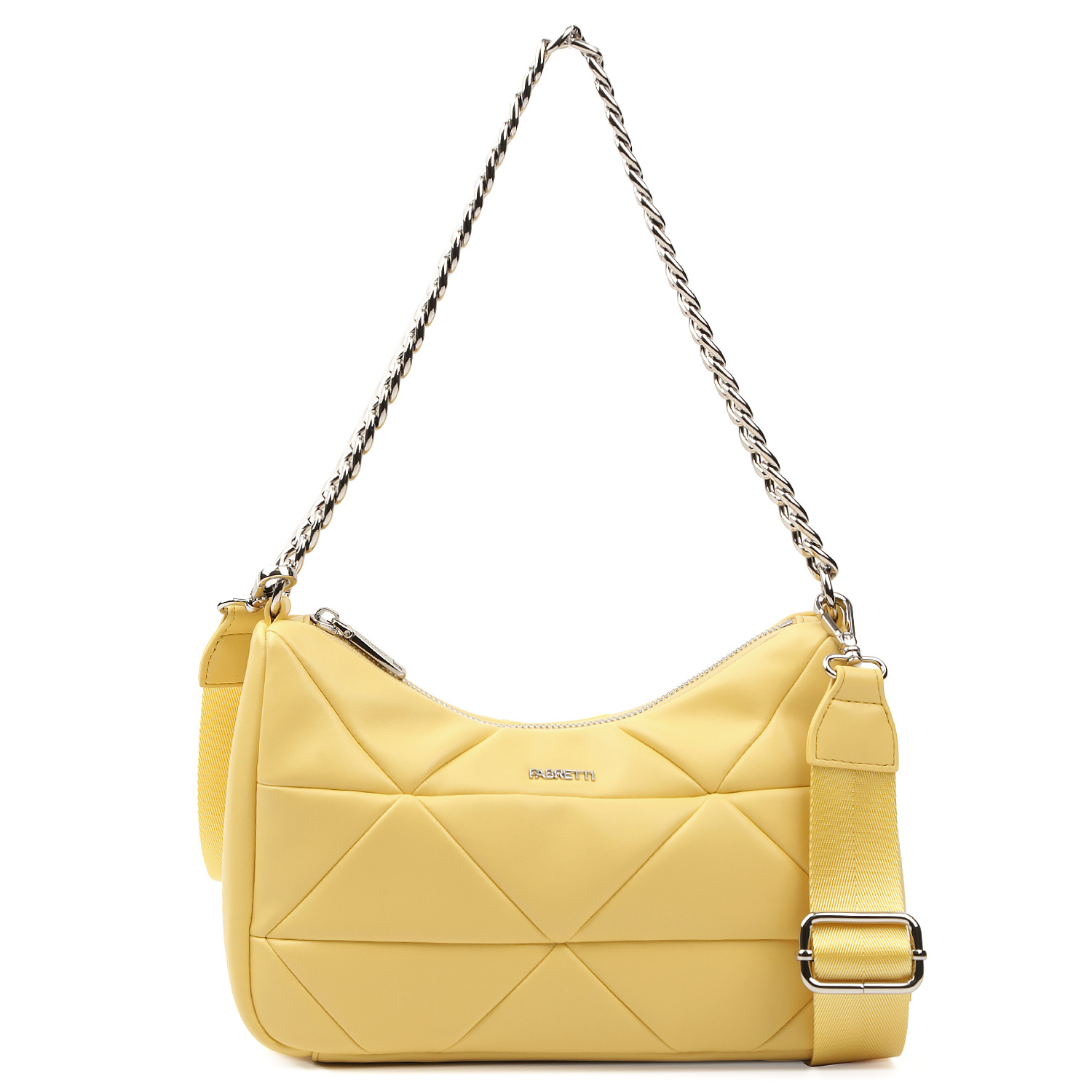 Оригинальная сумка через плечо FABRETTI в желтом оттенке выполнена из натуральной гладкой кожи и декорирована геометрической стежкой. Сумка закрывается на молнию с металлическим поводком. Внутри 2 боковых кармана для мелочей: открытый и на молнии. В качестве декора выступает съемная цепочка со средними звеньями, которая также может быть использована в качестве короткого ремня. Текстильный плечевой ремень регулируется по длине, ширина - 4 см. Цвет фурнитуры - серебро.