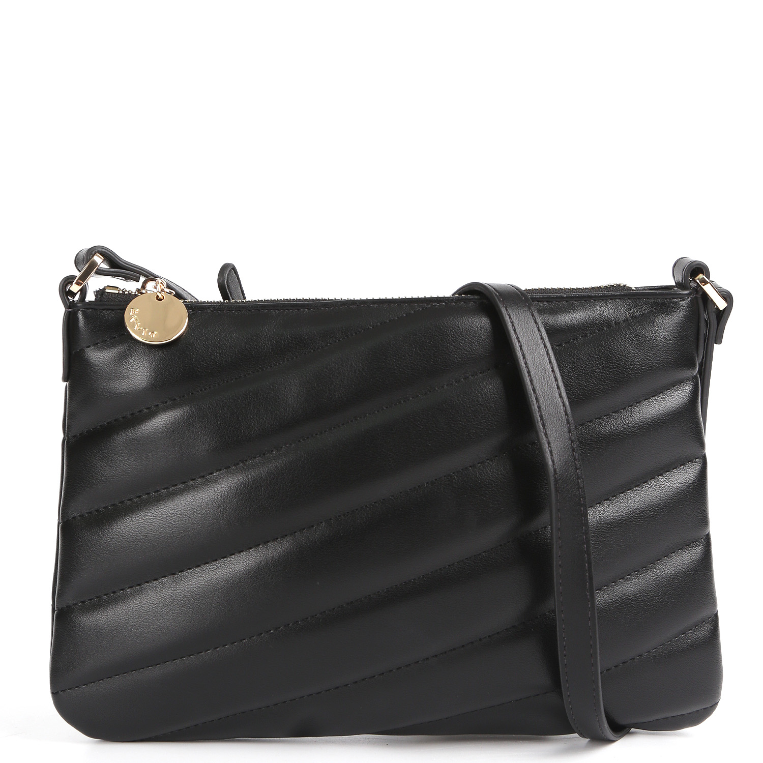 Компактная кросс-боди PALIO в черном цвете выполнена из натуральной гладкой кожи и декорирована диагональной стёжкой. Сумка закрывается на молнию с металлическим поводком. Внутри 2 боковых кармана для мелочей: открытый и на молнии. Плечевой ремень регулируется по длине, ширина - 1,5 см. Цвет фурнитуры - золото.