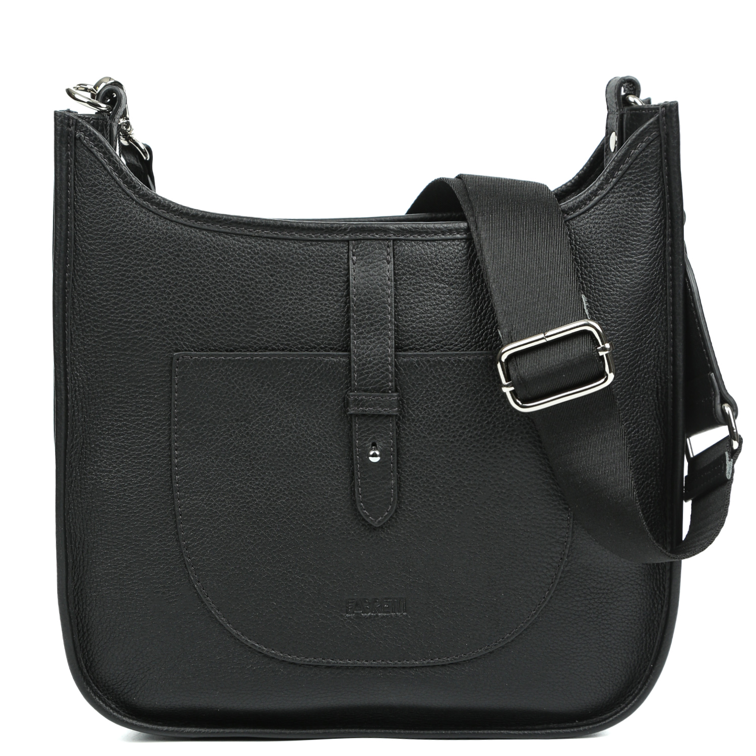Стильная сумка на плечо FABRETTI в черном цвете выполнена из натуральной зернистой кожи и хорошо держит форму. Основное отделение закрывается на молнию. Внутри 3 кармана для мелочей: 2 открытых и на молнии. На тыльной стороне предусмотрен карман быстрого доступа на молнии. На лицевой стороне расположен накладной карман, закрывающийся хлястиком, и выполняющий также декоративную функцию. Текстильный плечевой ремень съемный, регулируется по длине, ширина - 4 см. Цвет фурнитуры - серебро.