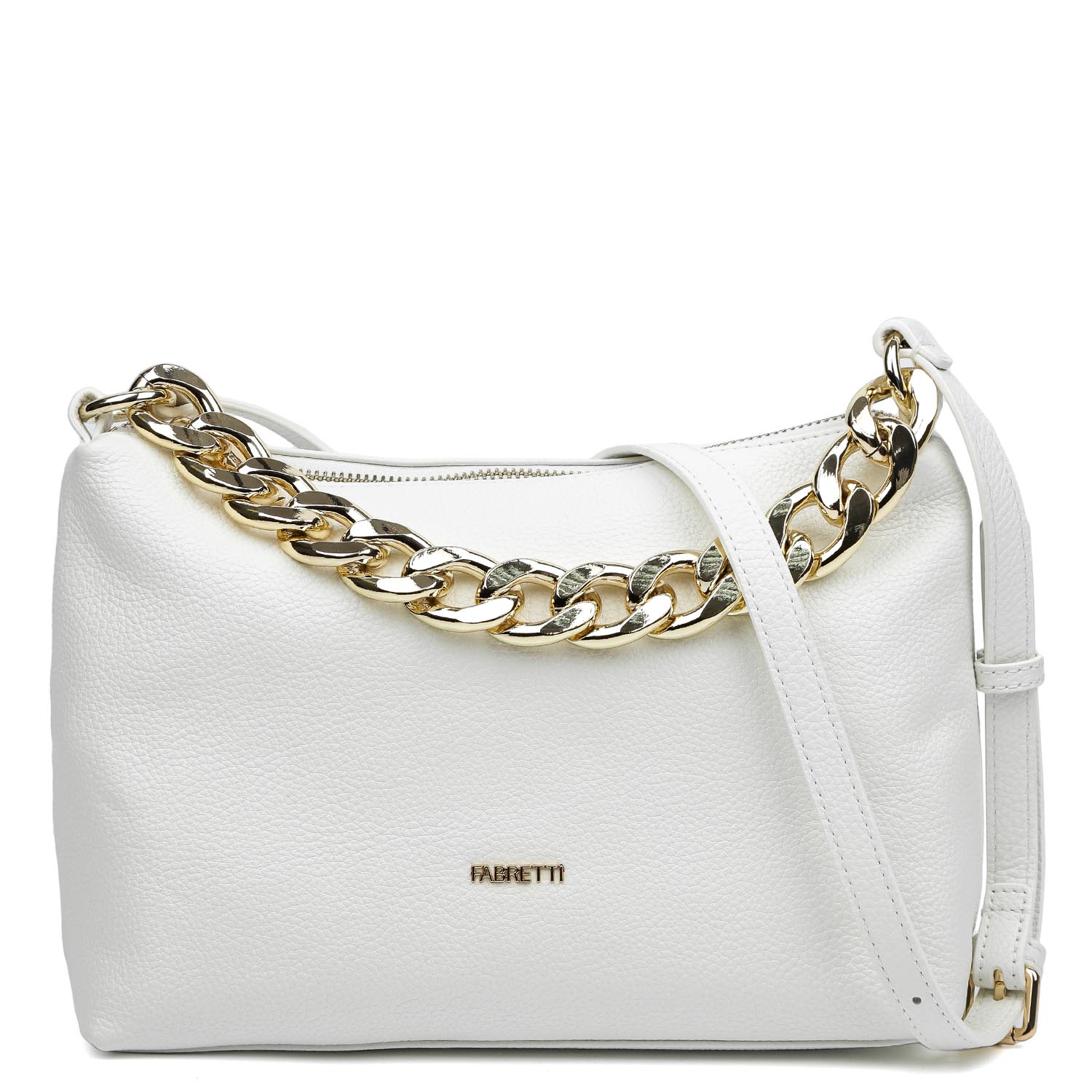 Вместительная кросс-боди FABRETTI в белом цвете выполнена из натуральной зернистой кожи. Основное отделение закрывается на молнию с металлическим поводком. Внутри 3 кармана для мелочей: 2 открытых и на молнии. В качестве декора выступает крупная цепь, которая также может выполнять функцию ручки, при необходимости ее можно снять. Плечевой ремень съемный, регулируется по длине, ширина - 1,5 см. Цвет фурнитуры - золото.