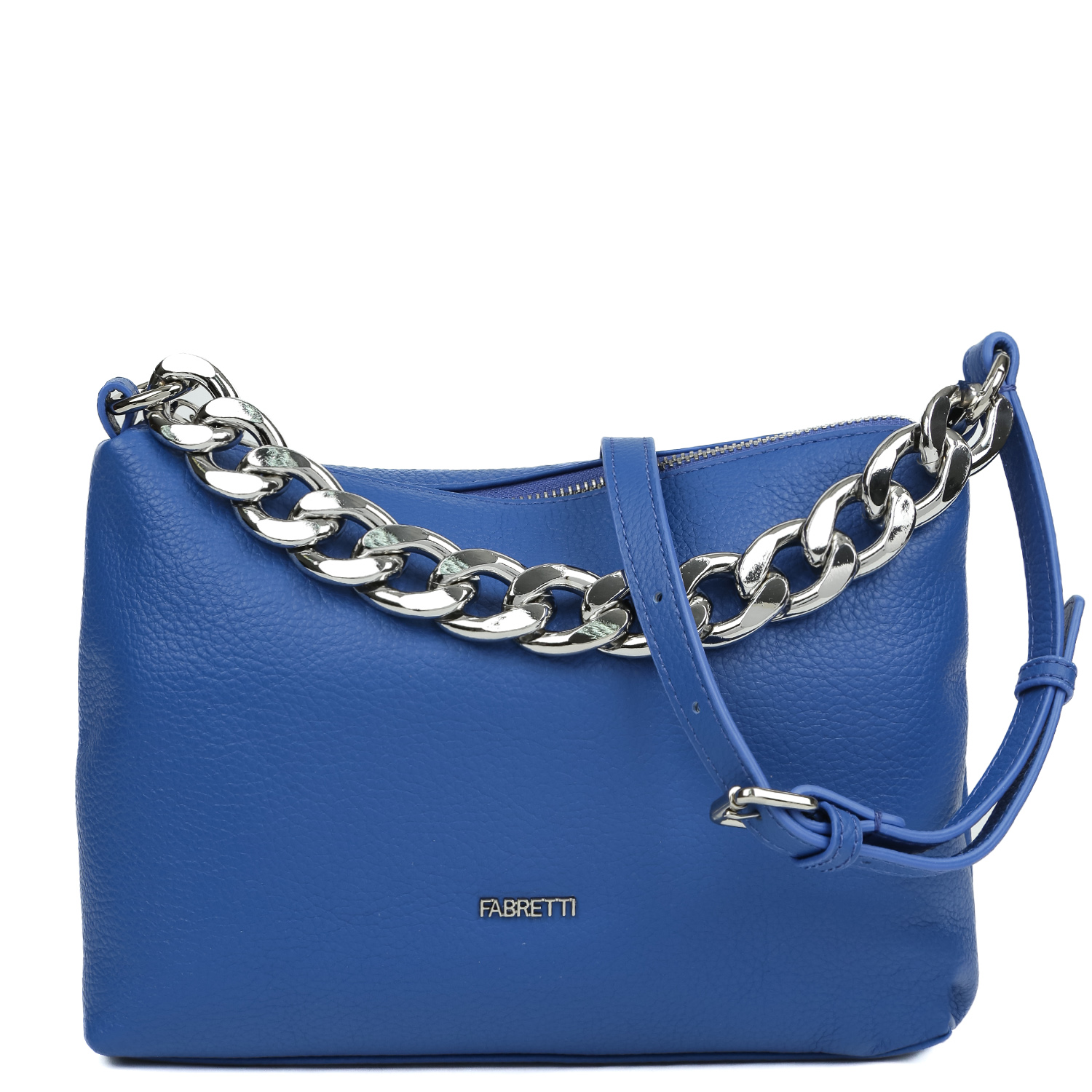 Вместительная кросс-боди FABRETTI в синем оттенке выполнена из натуральной зернистой кожи. Основное отделение закрывается на молнию с металлическим поводком. Внутри 3 кармана для мелочей: 2 открытых и на молнии. В качестве декора выступает крупная цепь, которая также может выполнять функцию ручки, при необходимости ее можно снять. Плечевой ремень съемный, регулируется по длине, ширина - 1,5 см. Цвет фурнитуры - серебро.