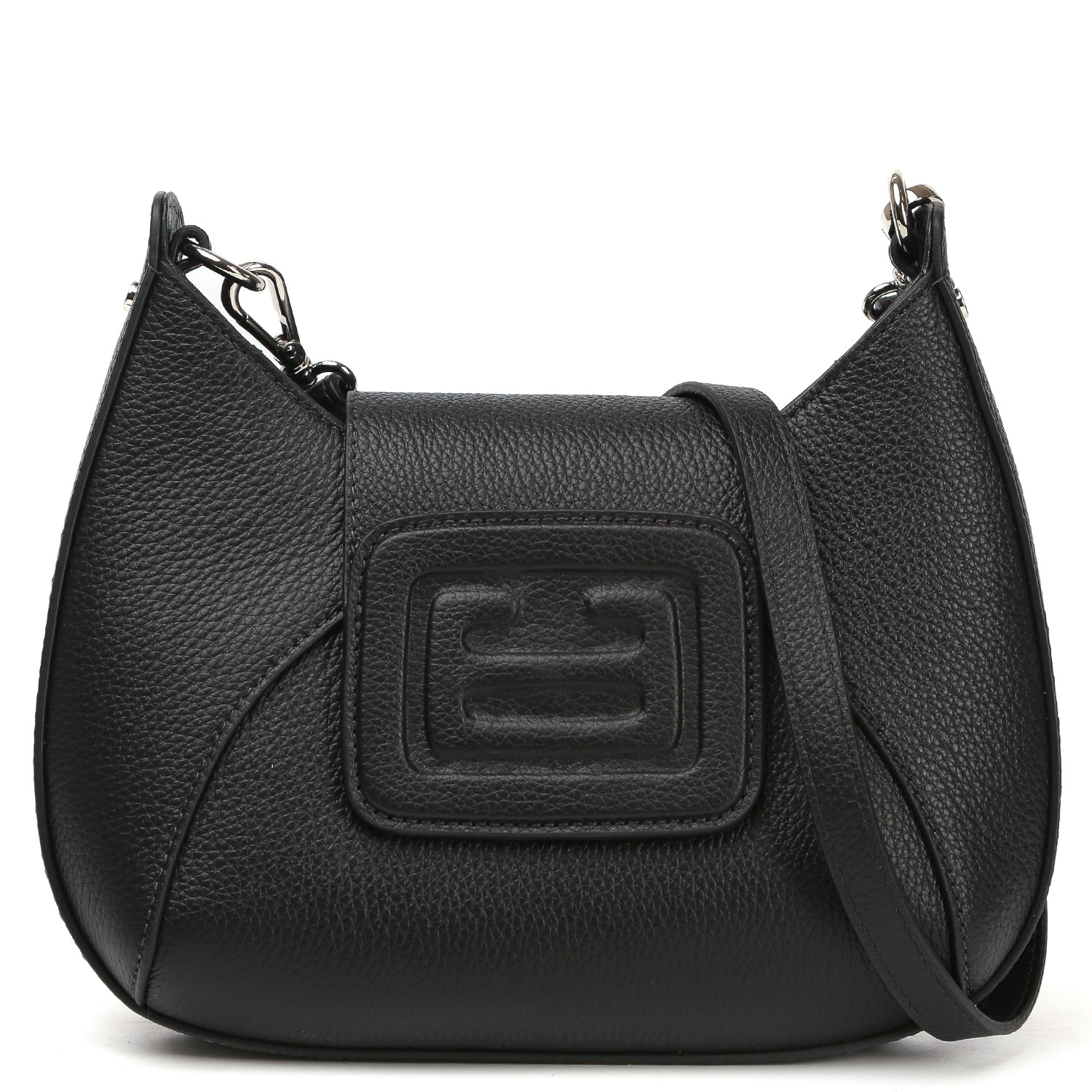 Компактная кросс-боди FABRETTI в черном цвете выполнена из натуральной зернистой кожи. Сумка закрывается хлястиком с магнитной кнопкой. Основное отделение на молнии. Внутри 2 кармана для мелочей: открытый и на молнии. Плечевой ремень съемный, регулируется по длине, ширина - 1,5 см. Высота крайних точек - 20 см, высота отделения - 16 см. Цвет фурнитуры - серебро.