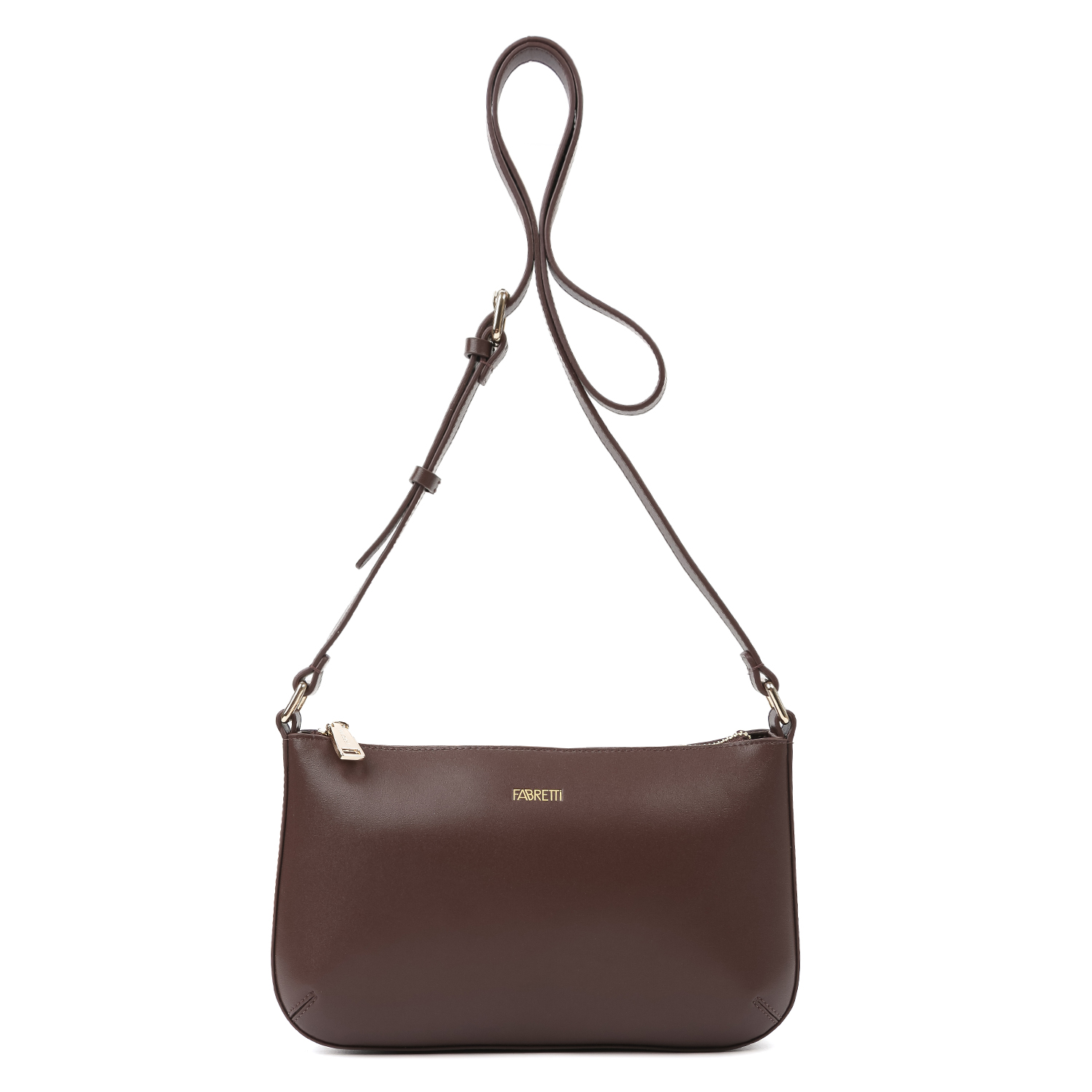 Элегантная и компактная сумка кросс-боди FABRETTI в оттенке темный шоколад. Выполнена из натуральной высококачественной гладкой кожи. Имеет регулируемый плечевой ремень с пряжкой длиной 129 см. Основное отделение закрывается на молнию. Внутри два кармана: на молнии и быстрого доступа. Золотистый логотип бренда украшает лицевую сторону. Цвет фурнитуры - золото. Материал подкладки: полиэстер. Эта компактная сумка идеально подойдет к повседневному и вечернему образу!