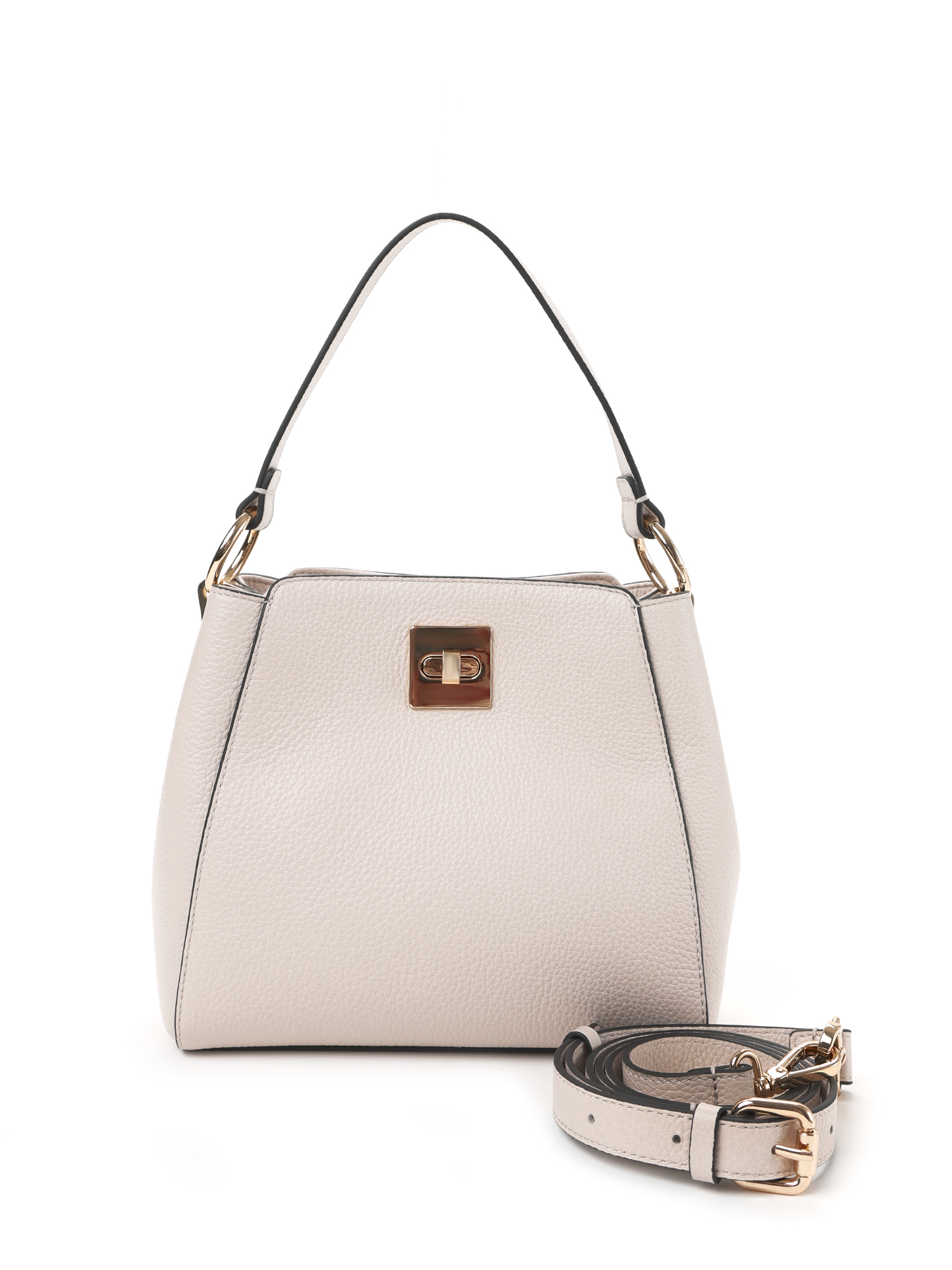 У сумки два отделения – одно на поворотном замке, второе на магнитном. Внутри открытый карман и на молнии. Эта сумка дополнена двумя съемными ремнями – небольшой ручкой на кольцах-карабинах и плечевым ремнем на карабинах, которые регулируется пряжкой. Длина ремня ок 125см. Цвет фурнитуры – золото.