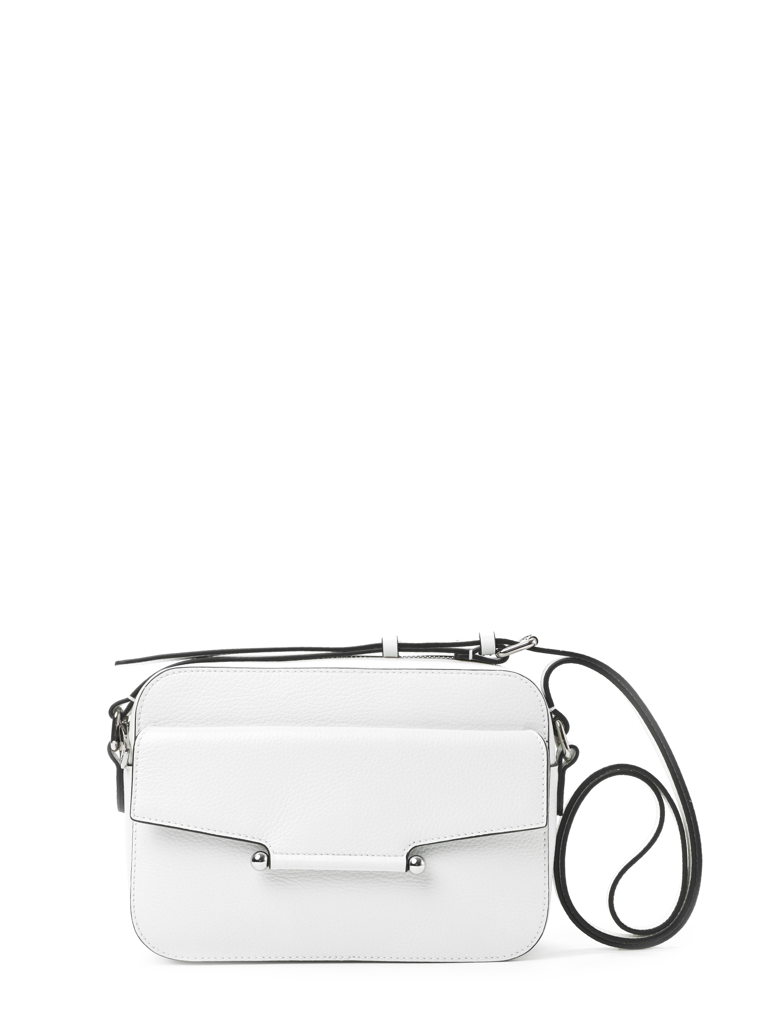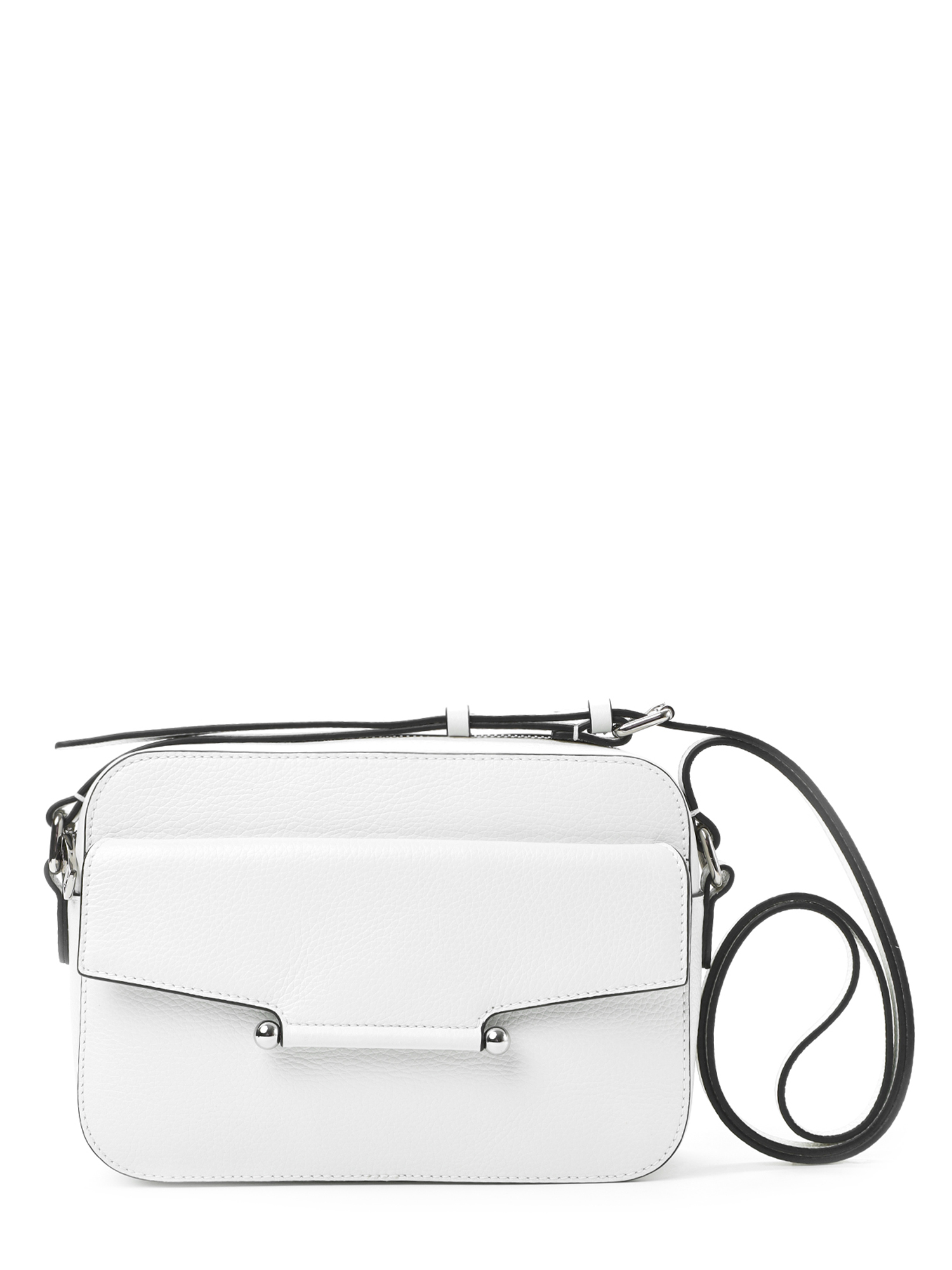 Небольшая прямоугольная женская сумка кросс-боди итальянского бренда FABRETTI из высококачественной натуральной кожи с мелкозернистой фактурой в белом цвете с контрастной черной окантовкой краев.
