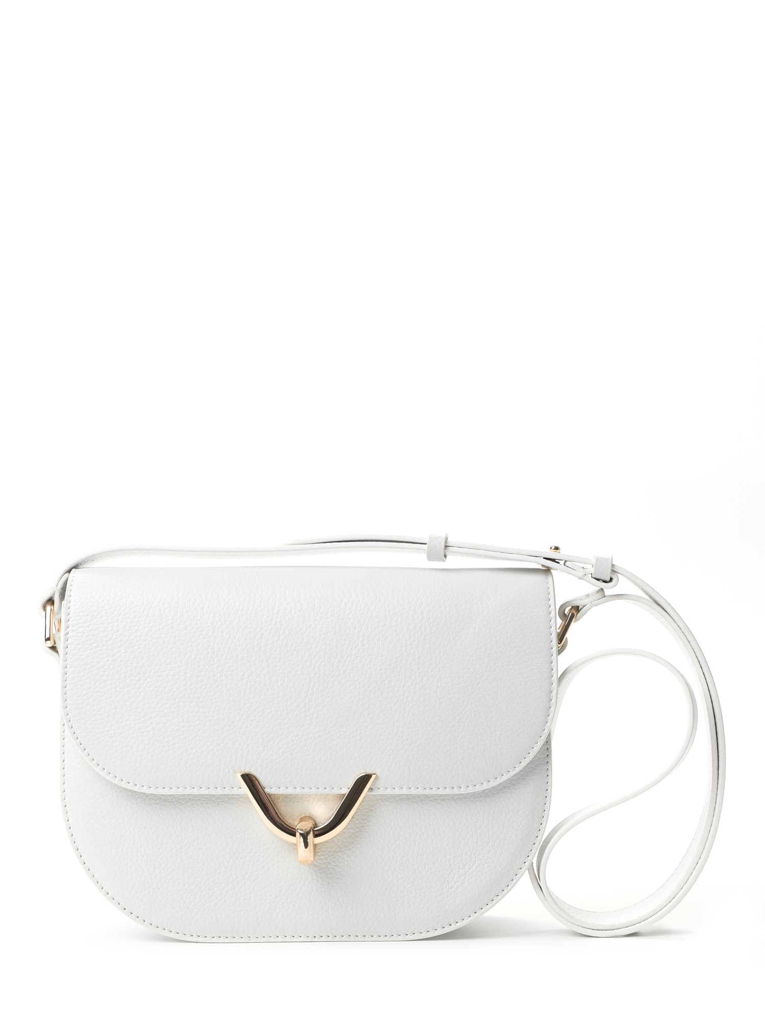 Небольшая женская сумка кросс-боди итальянского бренда FABRETTI из натуральной кожи белого цвета с зернистой фактурой. Изящная модель со сглаженными углами, закрывающаяся клапаном с блестящим золотистым поворотным замком. Внутри одно отделение с небольшим открытым карманом.