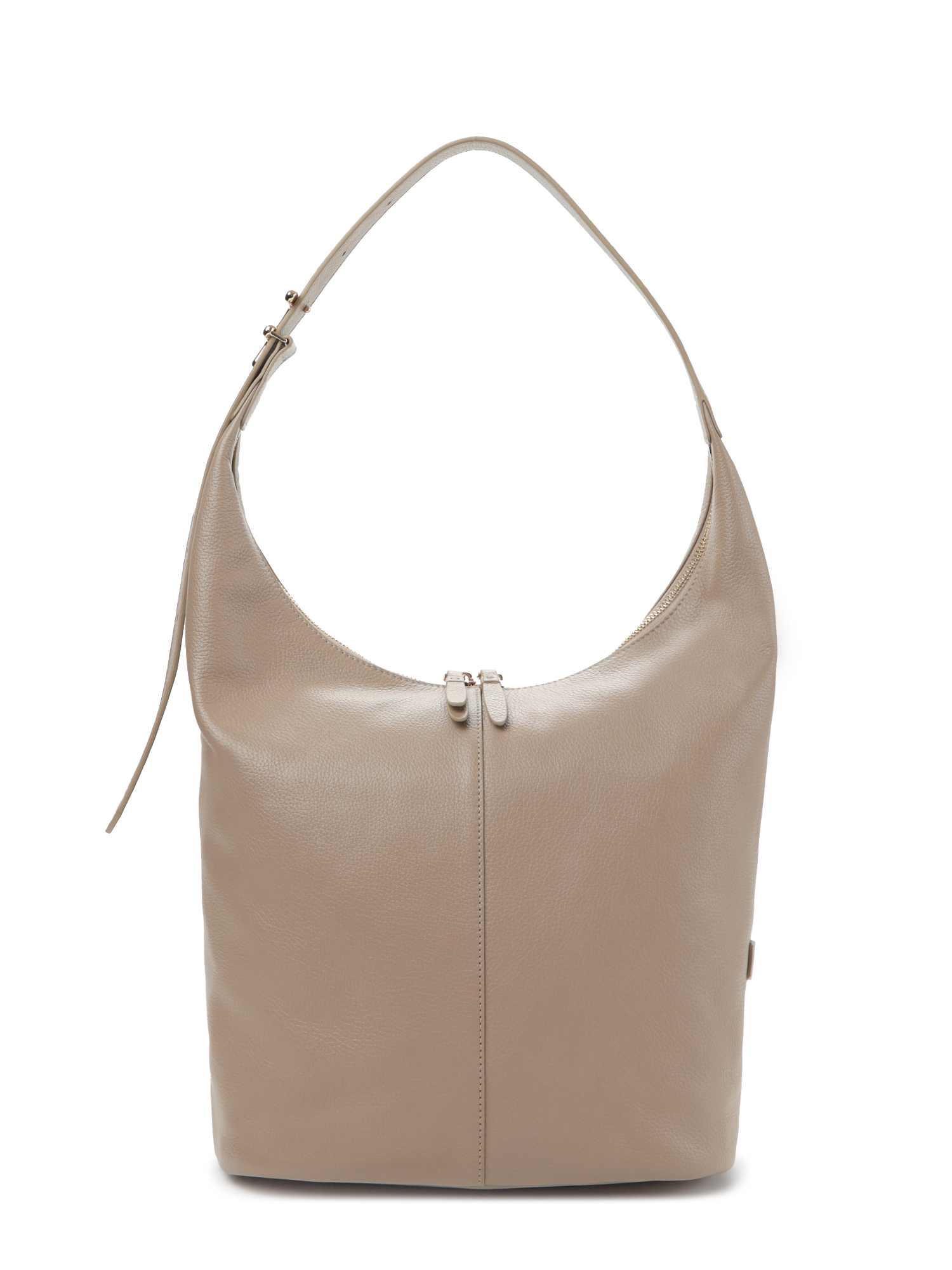 У этой модели мягкая свободная форма благодаря нежной натуральной коже с зернистой фактурой. Теплый кофейно-бежевый цвет хорошо сочетается с натуральными оттенками – базой для повседневной одежды.