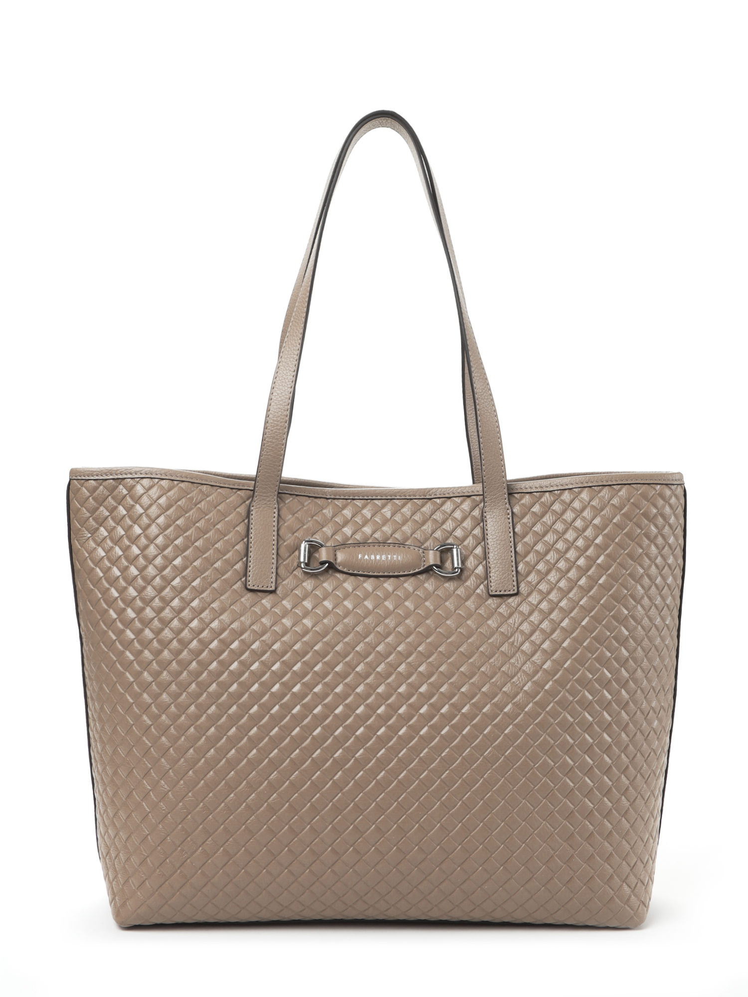 Вместительная женская сумка тоут итальянского бренда FABRETTI – классика городского стиля. Она выполнена из высококачественной натуральной кожи с мелкозернистой фактурой и тиснением, имитирующим плетеный узор. Окрашена в теплый серо-бежевый оттенок.