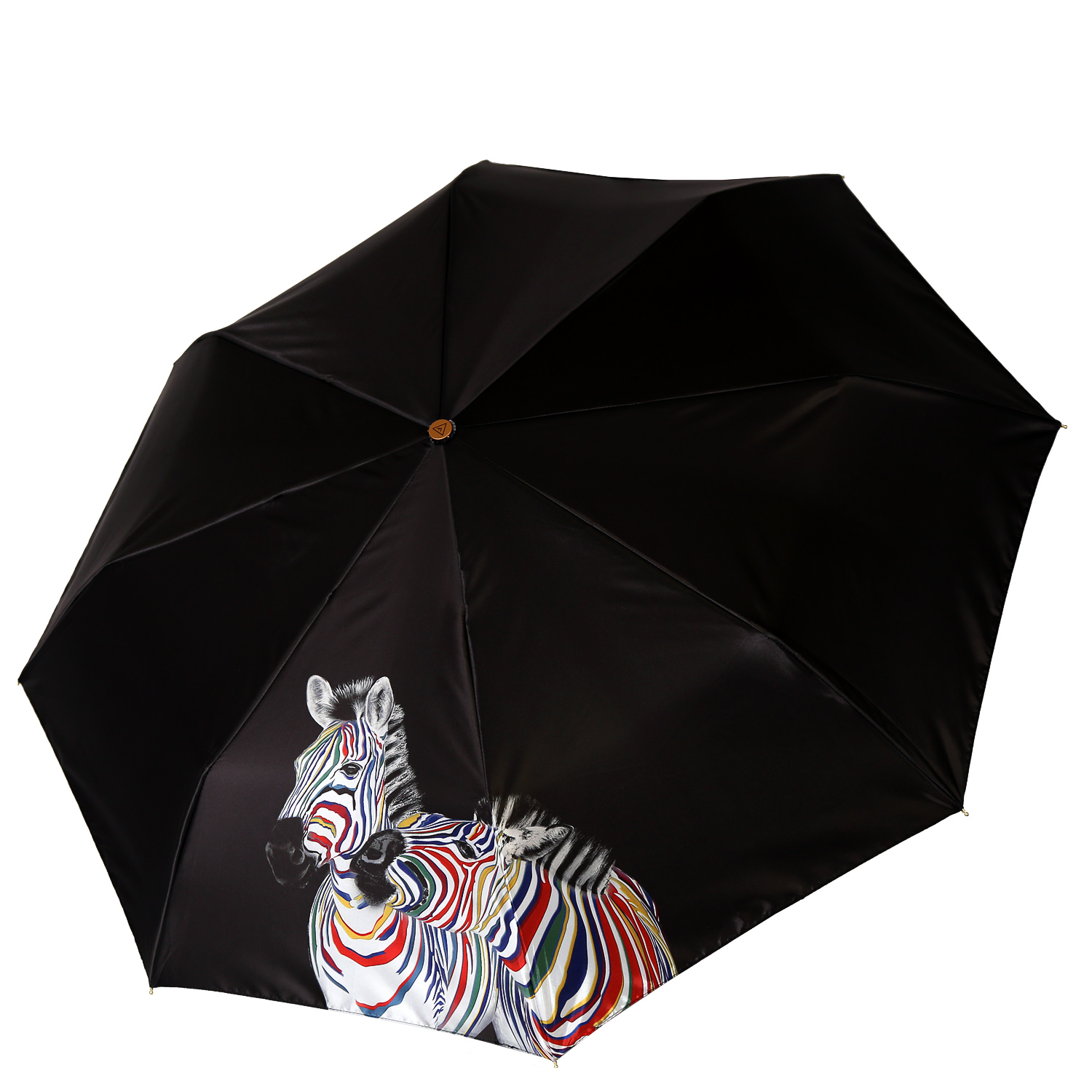 Для создания купола зонта-автомата FABRETTI использовали прочный полиэстер с приятной гладкой фактурой и сатиновым блеском. На однотонном черном фоне расположилась пара зебр, выполненных в технике поп-арт. Четкий рисунок и тонкую цветопередачу удалось получить с помощью техники цифровой печати, которая обеспечивает долговечность изображению.