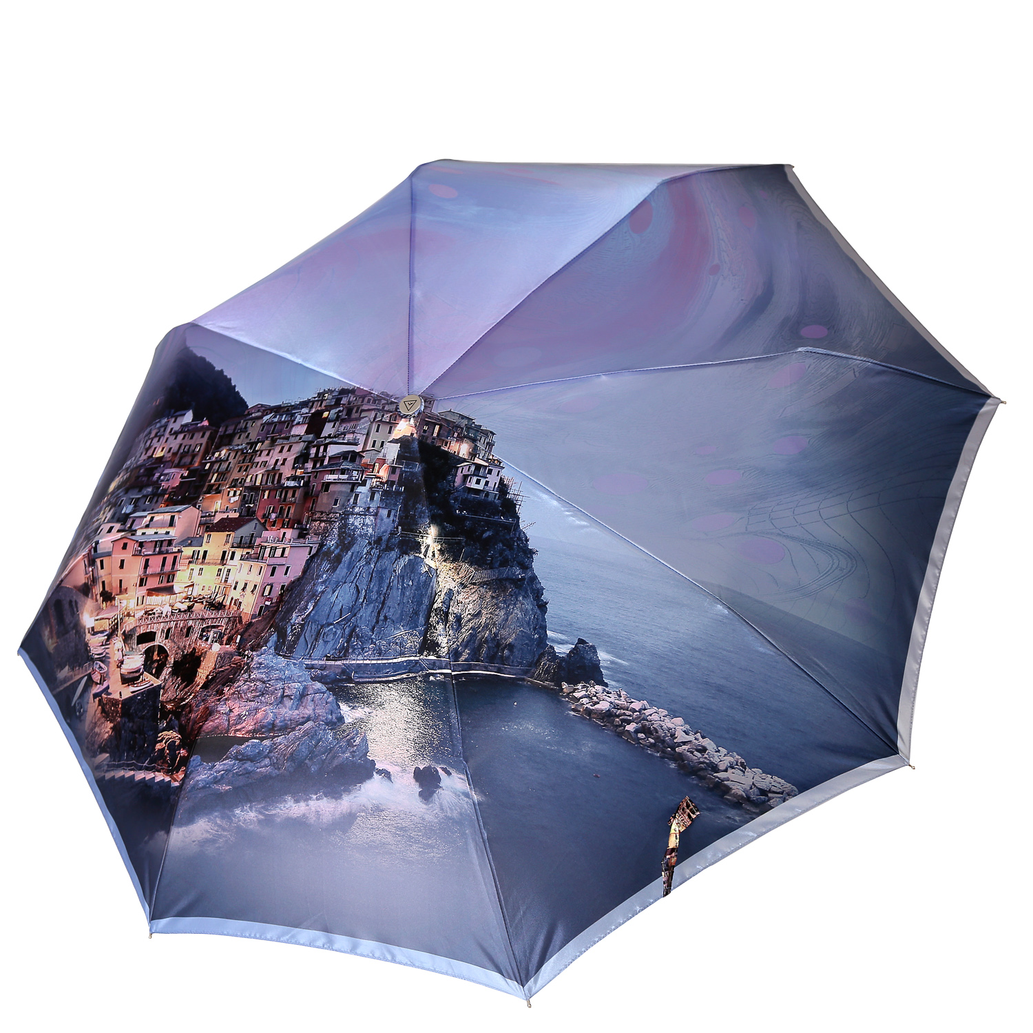 Для создания купола зонта-автомата FABRETTI использовали прочный полиэстер с приятной гладкой фактурой и сатиновым блеском. Вода, попадая на такой купол, превращается в капли и легко скатываться вниз. Купол украшает изображение небольшого городка на Лигурийском побережье Италии. Четкий рисунок и тонкую цветопередачу удалось получить с помощью техники цифровой печати, которая обеспечивает долговечность изображению.