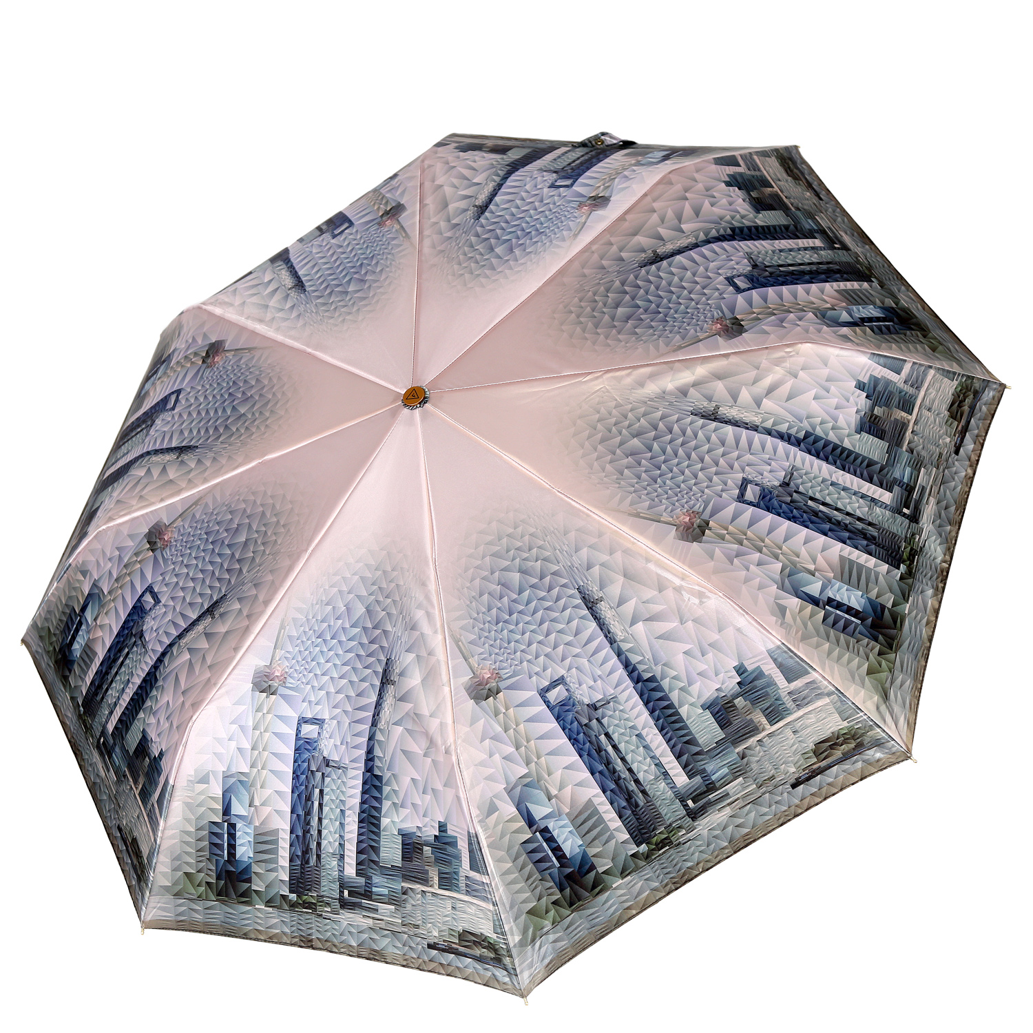 Женский зонт-автомат FABRETTI украшает дизайнерский принт в виде абстрактных элементов, из которых складываются изображения небоскребов. Рисунок нанесен методом цифровой печати, что обеспечивает точную цветопередачу и делает устойчивым к выцветанию. Купол изготовлен из полиэстера (сатин), обладающего шелковистым блеском и износостойкостью. Эргономичная ручка выполнена из полиуретана. Облегченный каркас - из стали. Зонт снабжен автоматическим механизмом сложения и системой "антиветер". Надежная конструкция обеспечивает защиту при порывах ветра.