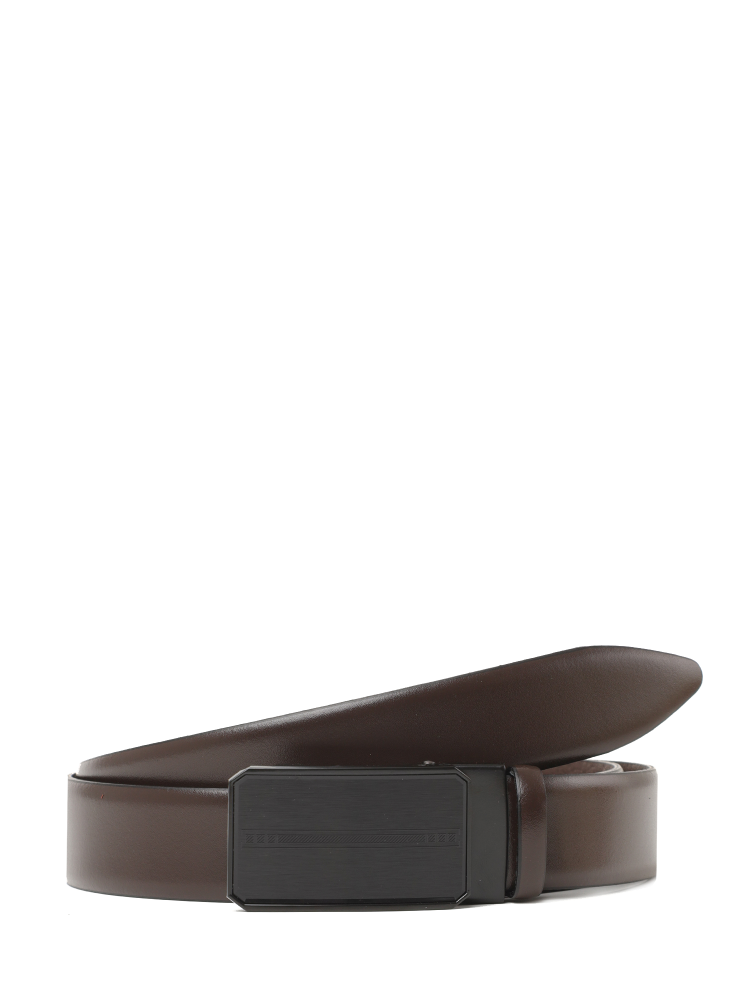 Ремень оснащен автоматической пряжкой черного цвета с тонким геометрическим узором и дополнен одной подвижной кожаной шлевкой. Пряжка съемная для самостоятельной корректировки длины ремня.