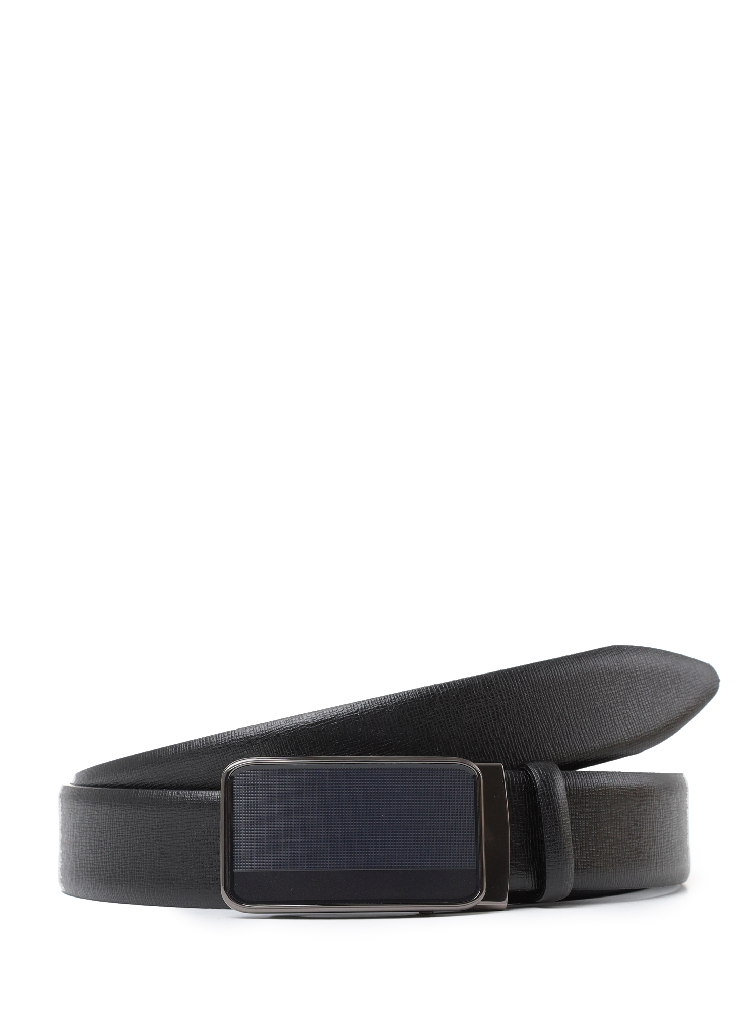 Ремень оснащен автоматической пряжкой черного цвета с тонким геометрическим узором и дополнен одной подвижной кожаной шлевкой. Пряжка съемная для самостоятельной корректировки длины ремня.