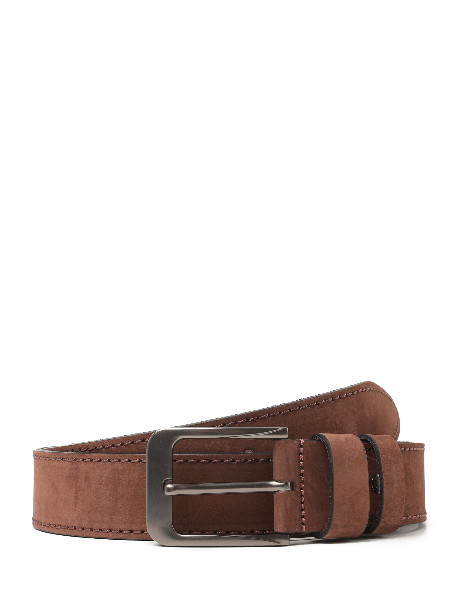 Стильный мужской ремень из высококачественного нубука от итальянского бренда FABRETTI – яркий акцент для любого образа. Широкий ремень теплого коричневого цвета подходит для ношения с джинсами. Он дополнен крупной прямоугольной пряжкой цвета черненого никеля; по краям идет шов отстрочки в тон коже.