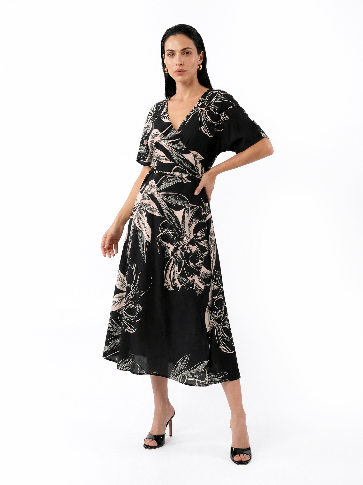 Великолепное летнее длинное платье итальянского бренда FABRETTI в монохромном дизайне: черный фон модели украшен светло-бежевым цветочным узором.