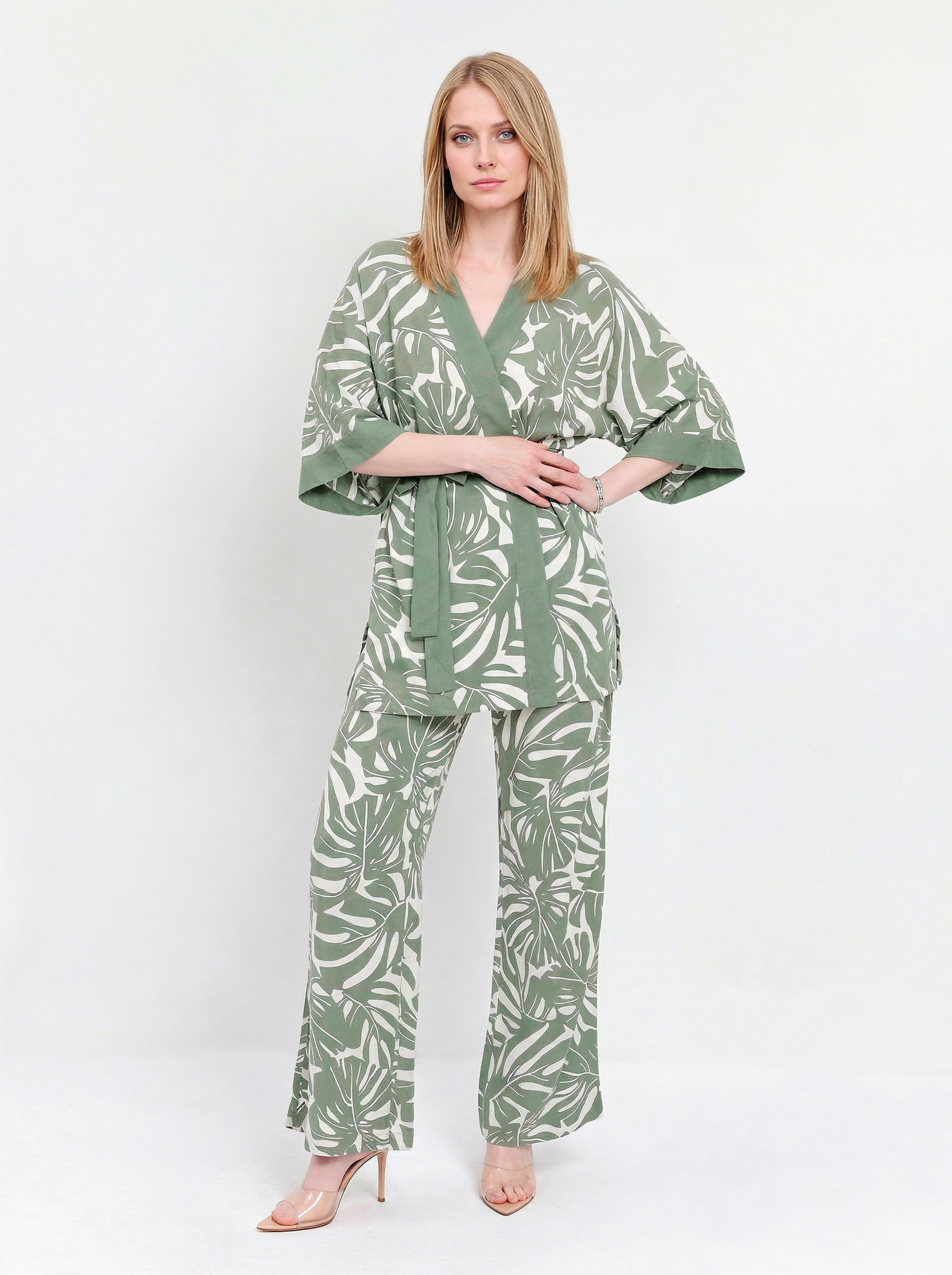 Костюм состоит из брюк и широкой туники, выполненных из легкой дышащей вискозы и украшенных узором в виде листьев тропической монстеры.