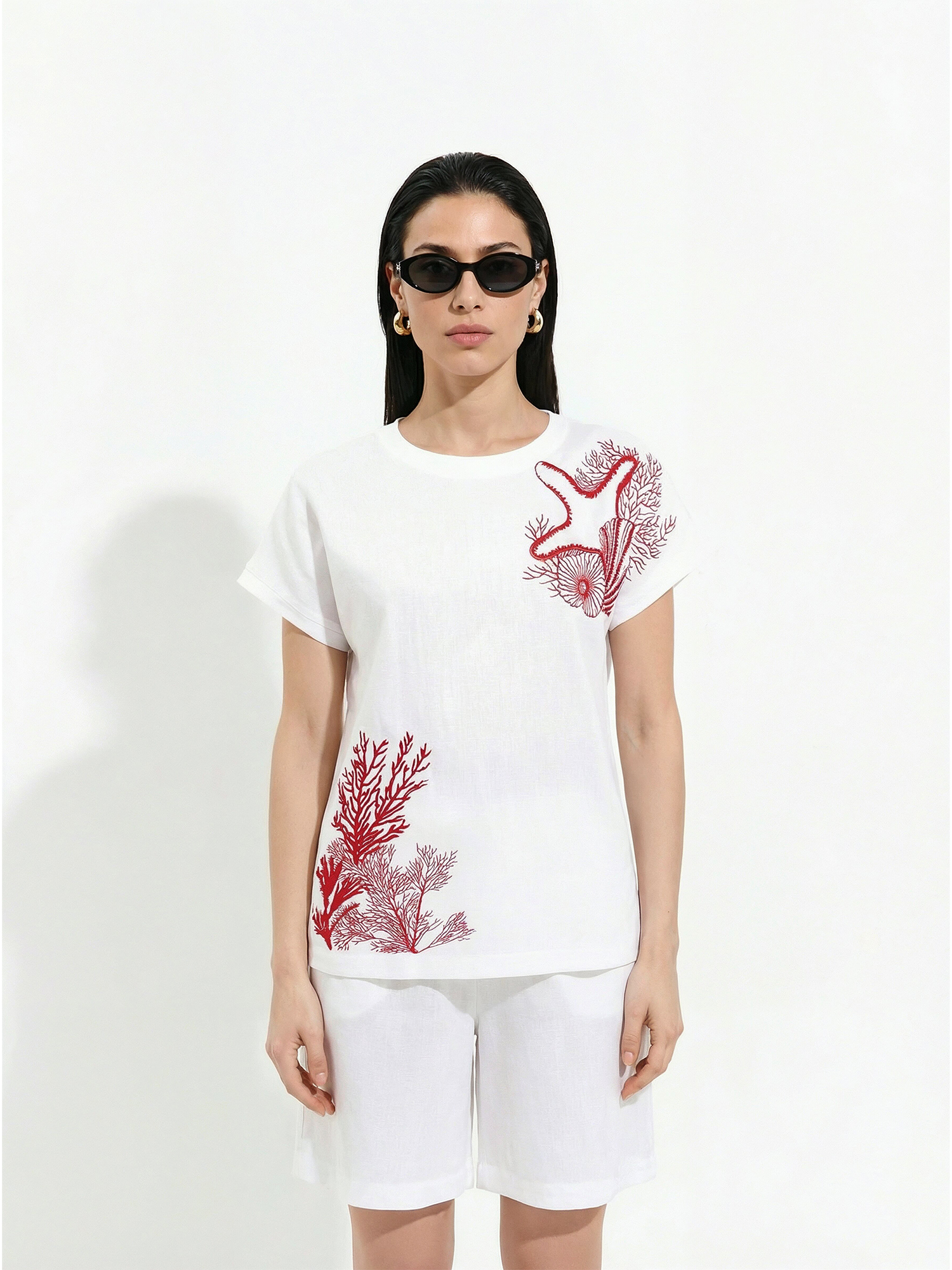 У футболки легкий А-силуэт, укороченные рукава и округлый вырез горловины с обтачкой. По бокам небольшие разрезы. Вышивки в виде кораллов, ракушек и морских звезд смотрятся очень эффектно и придают модели расслабляющую курортную атмосферу.