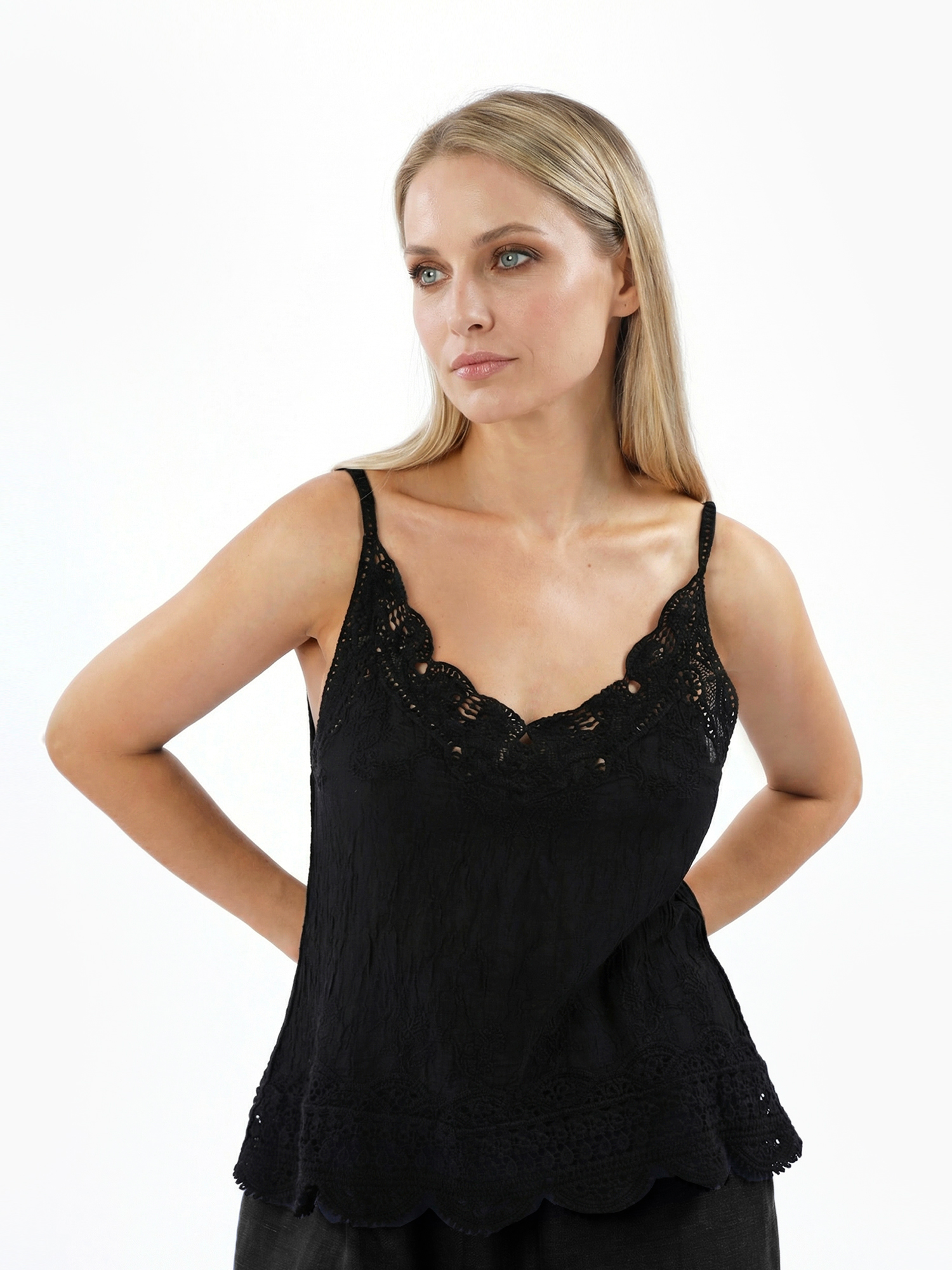 У топа свободный А-силуэт и интересный декор: верх и низ выполнены из кружева, сочетающего разные узоры и дополнены растительной вышивкой. Тонкие бретели также кружевные.