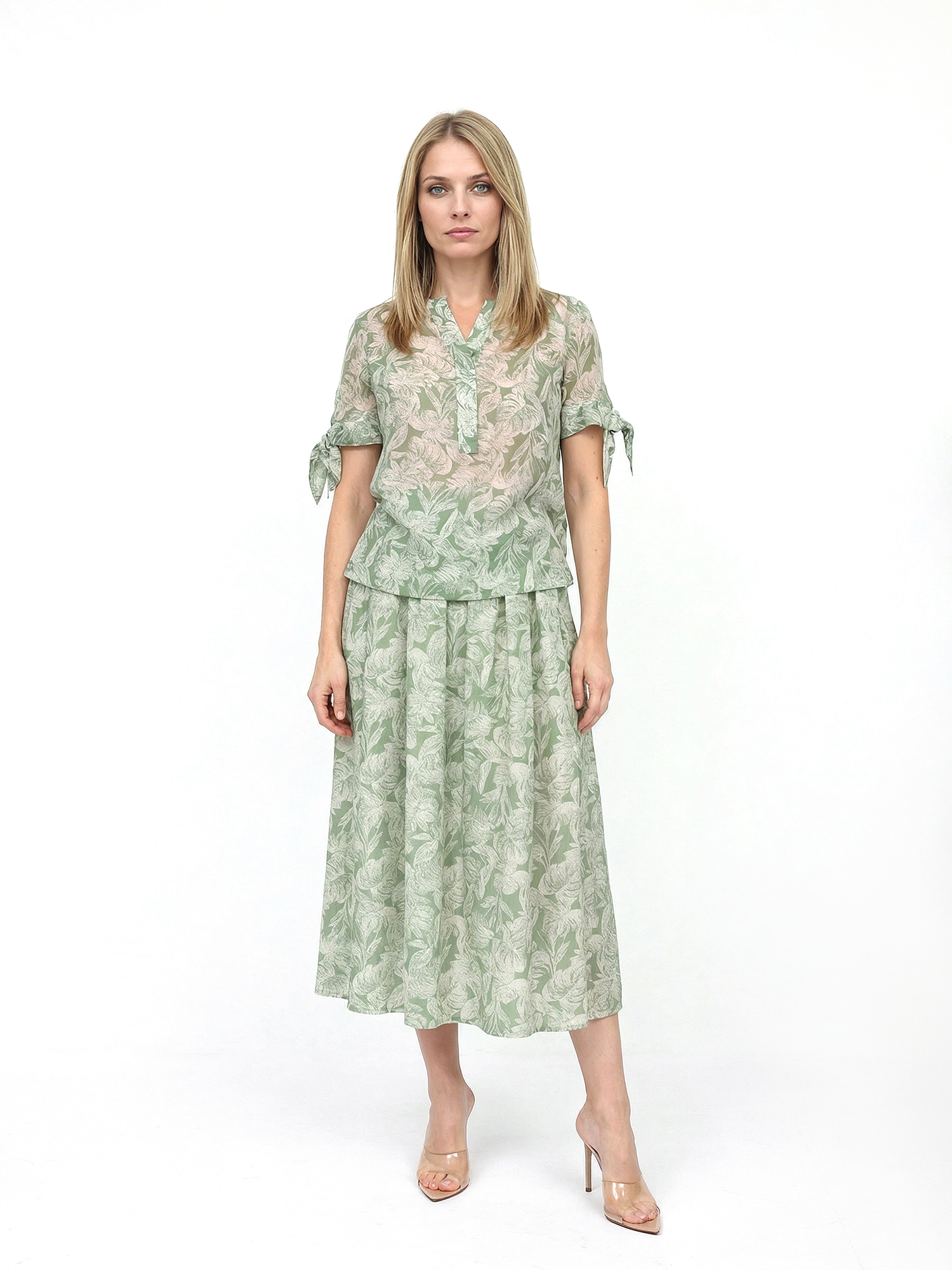 Легкая летняя блуза итальянского бренда FABRETTI мягкого зеленого цвета с детализированным растительным узором светлых тонов.