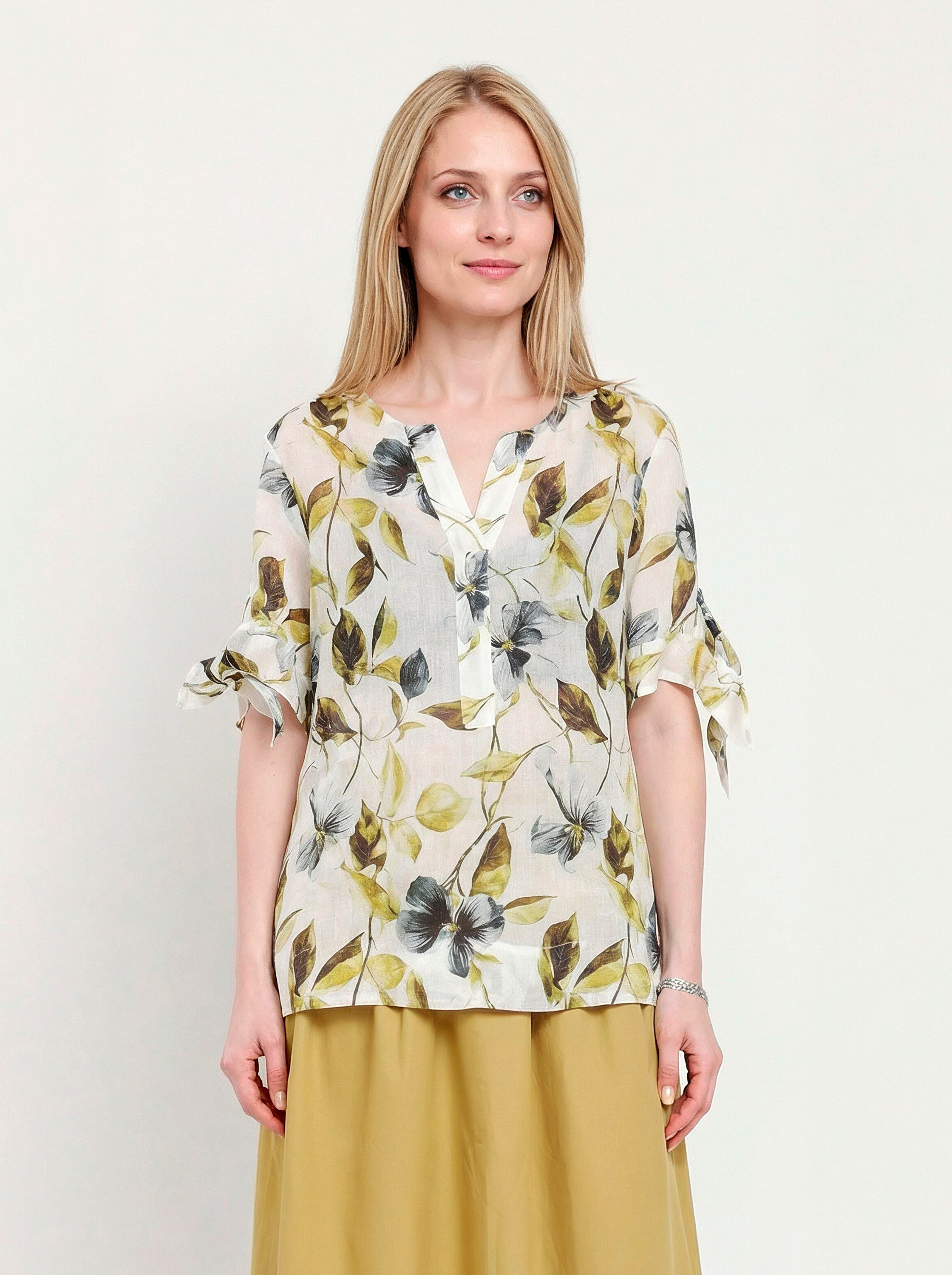 Эта модель украсит летний образ свежими цветами и оригинальными дизайнерскими решениями. Легкая полупрозрачная ткань рами отлично подходит для жаркой погоды – она хорошо пропускает воздух и обладает приятной к телу фактурой.
