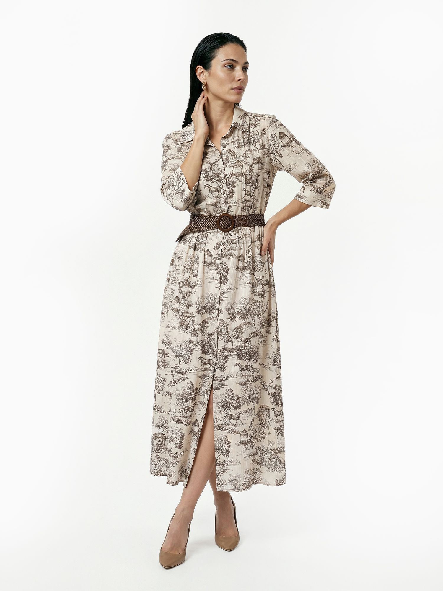 Длинное легкое платье итальянского бренда FABRETTI в светло-бежевом тоне, украшенное деликатным пейзажным принтом с домами, деревьями и лошадьми.