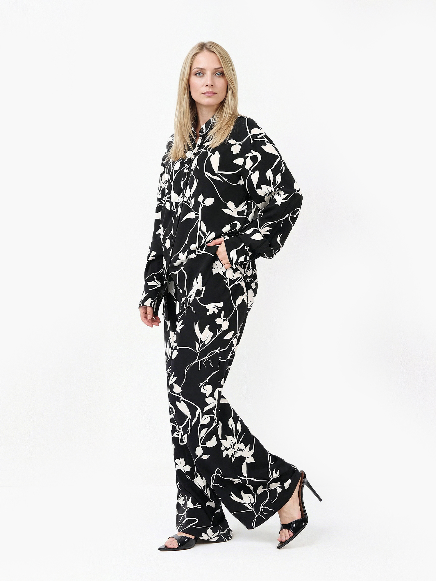 Летний брючный костюм итальянского бренда FABRETTI в монохромной гамме – черный фон украшен изящным белым растительным орнаментом.