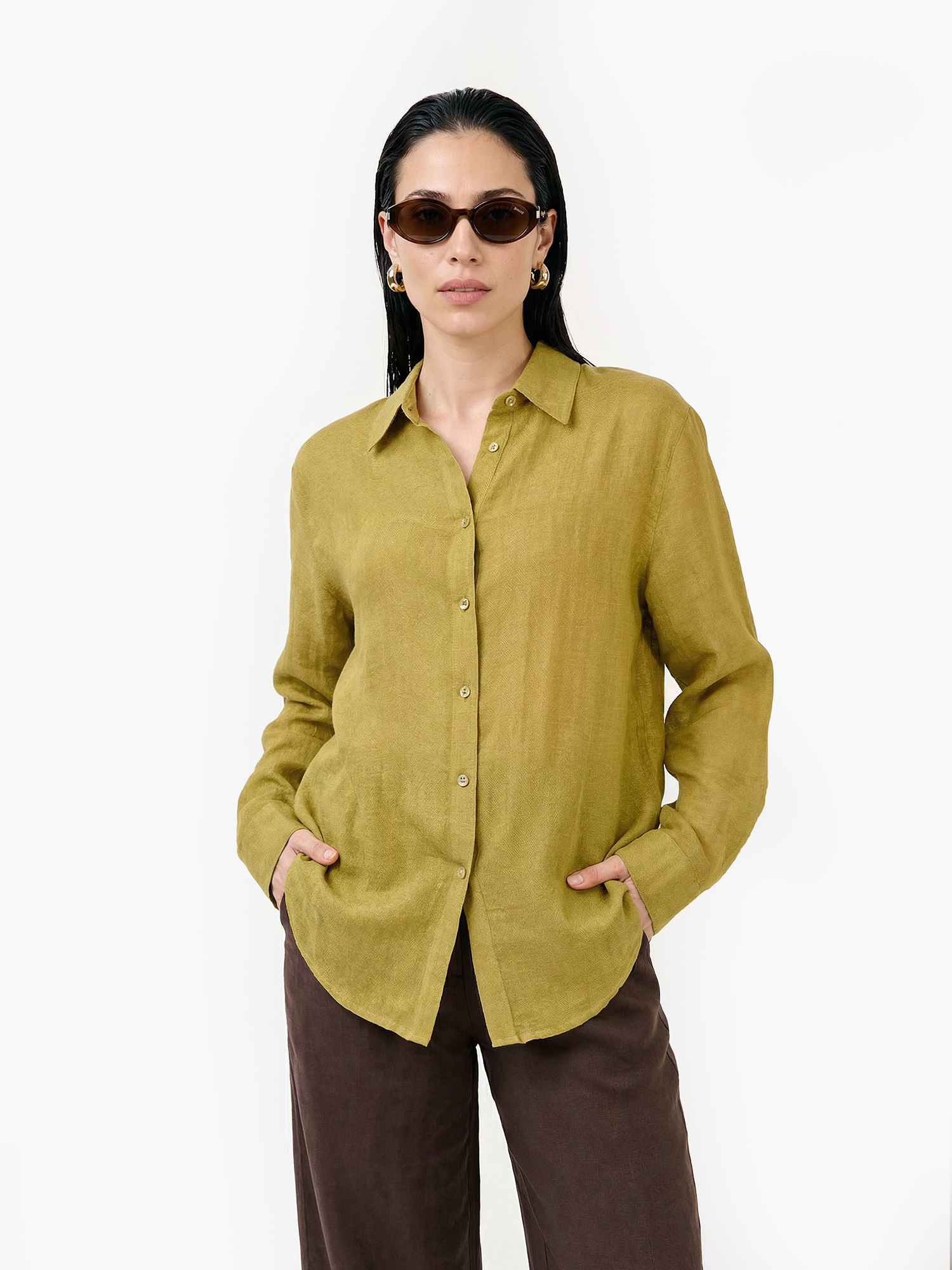 Легкая летняя женская рубашка итальянского бренда FABRETTI нежного цвета зеленого горошка с фактурой ткани «елочкой».
