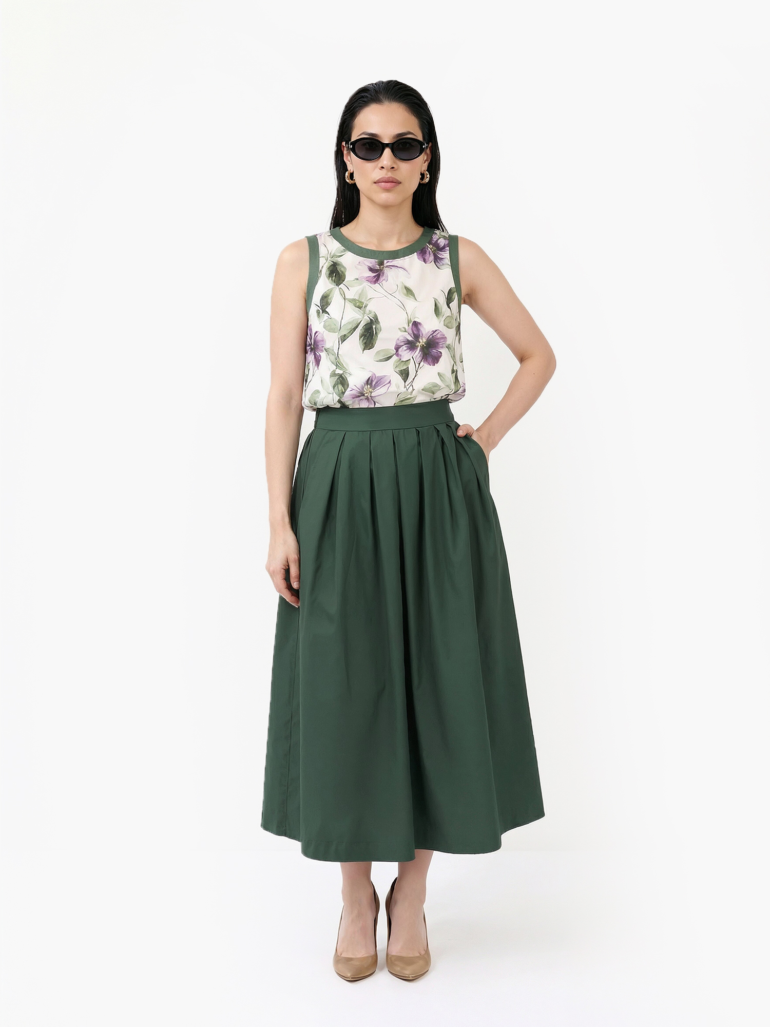 У модели А-силуэт с вытачками на груди, округлый вырез горловина и пройма дополнены вставками из однотонного зеленого трикотажа в рубчик. Ткань украшена летним принтом с цветущими лозами, цветы дополнены сияющими стразами.