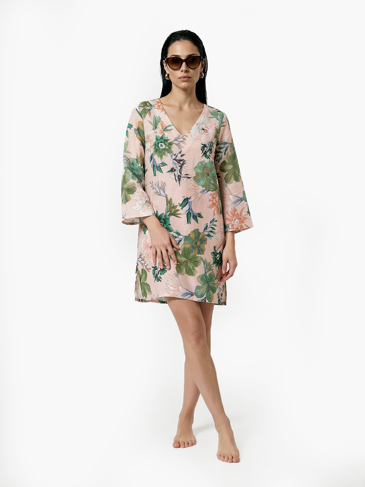 У модели легкий А-силуэт, глубокий V-образный вырез горловины, изящно подчеркивающий зону декольте и визуально удлиняющий шею. Рукава длиной три четверти в свободном крое не стесняют движений рук. По бокам туника дополнена высокими разрезами.