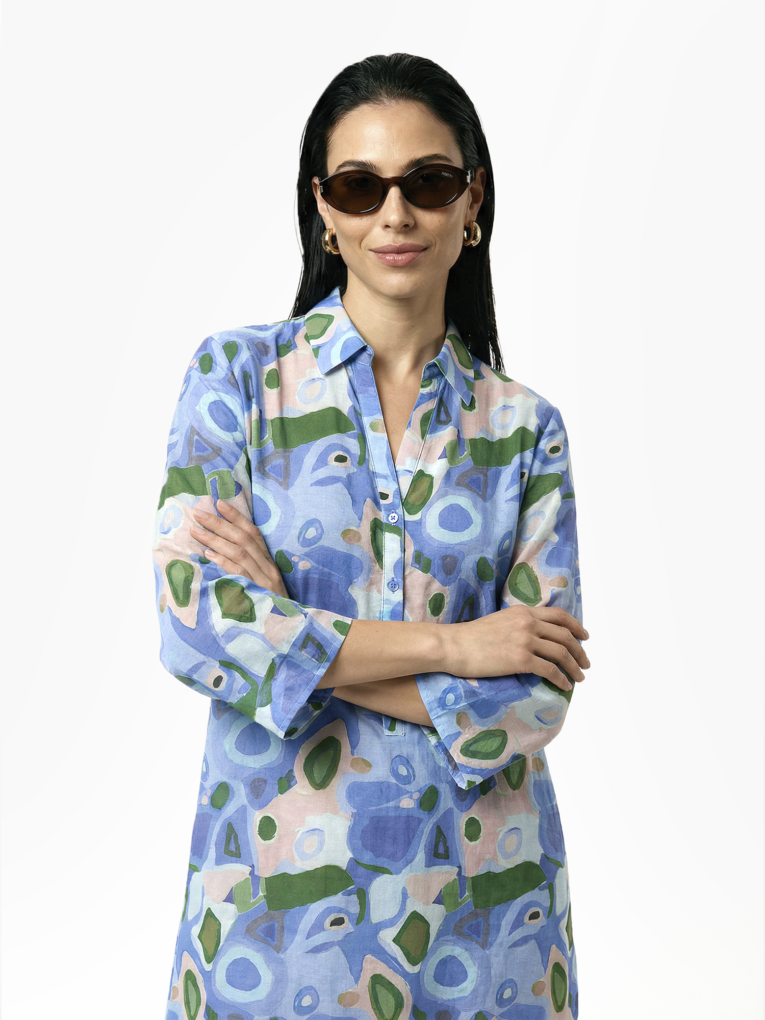 Легкая летняя туника итальянского бренда FABRETTI, украшенная ярким абстрактным узором в голубых тонах.