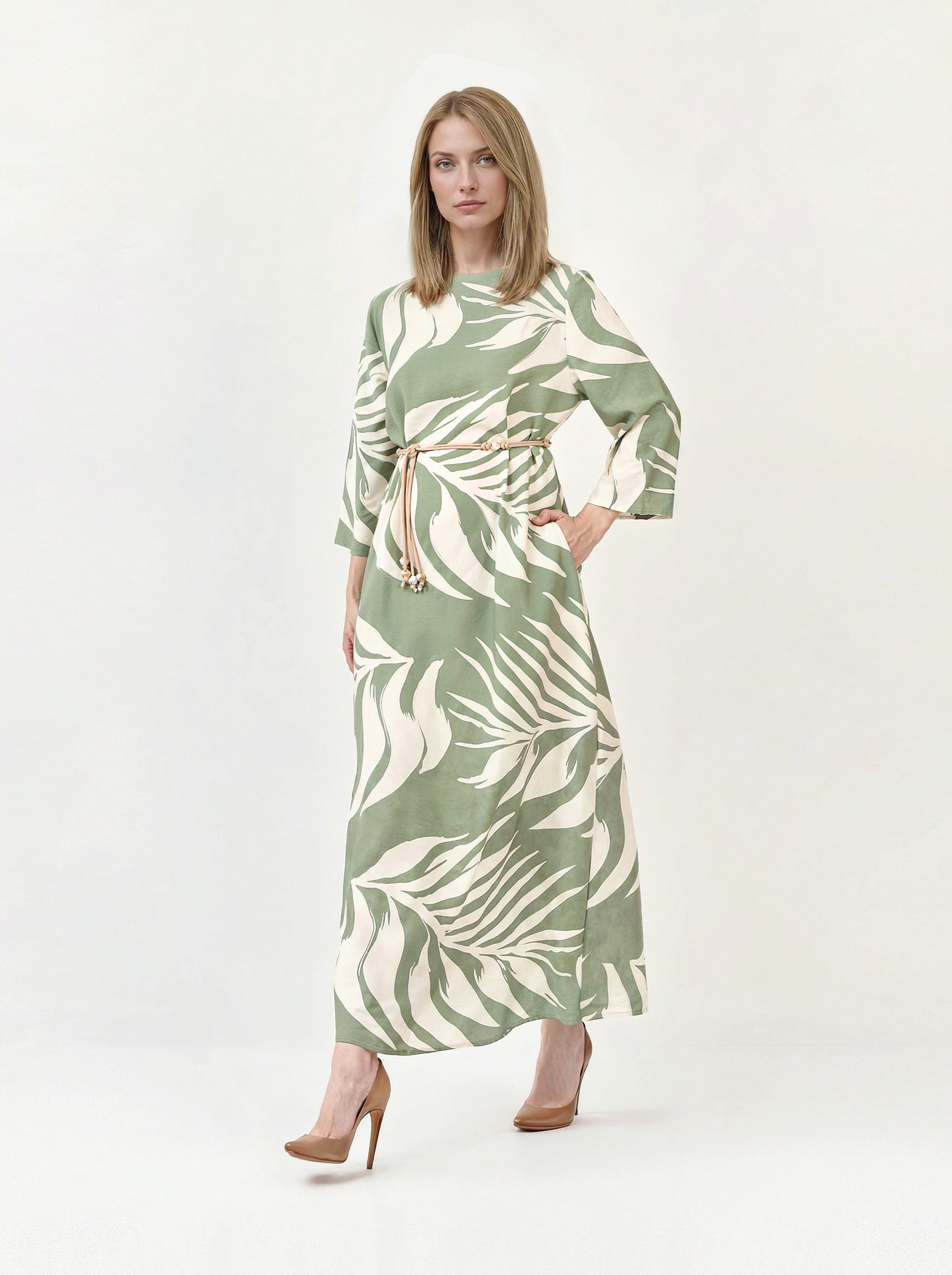 Великолепное летнее платье итальянского бренда FABRETTI мягкого зеленого цвета с тропическим узором в виде листьев монстеры.