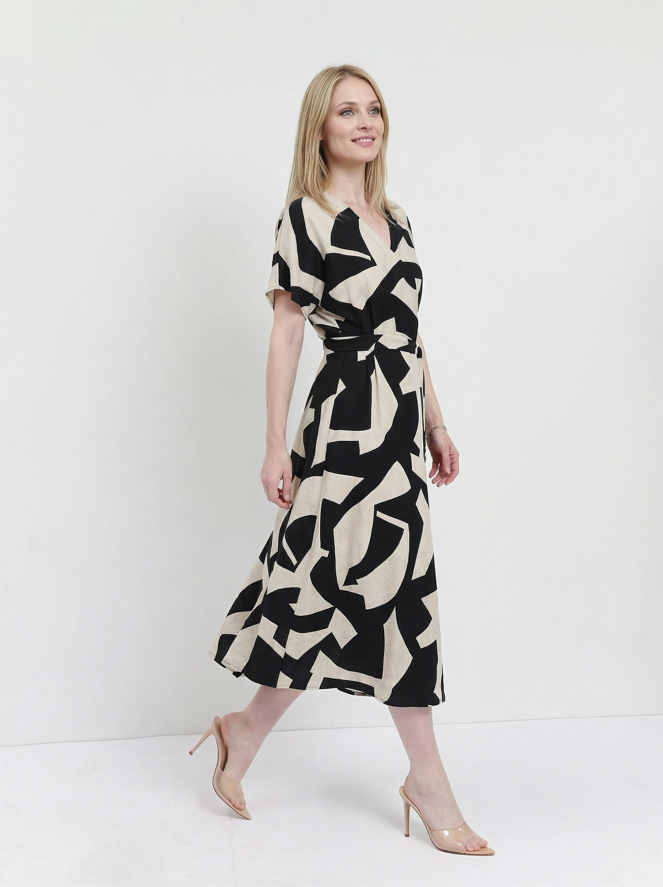 Великолепное летнее длинное платье итальянского бренда FABRETTI с крупным черным и бежевым абстрактным геометрическим узором.